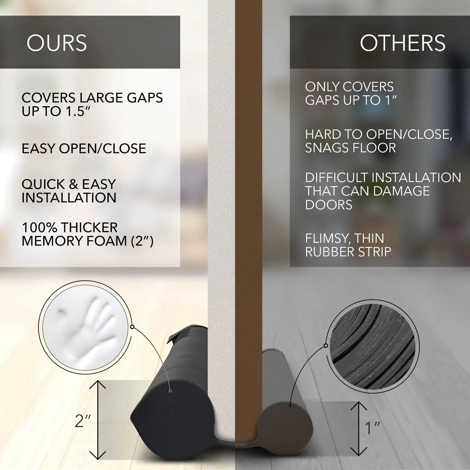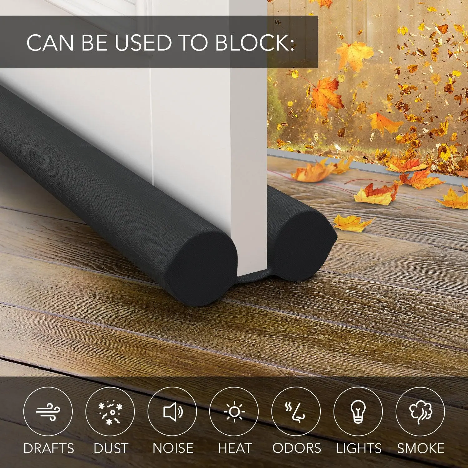 Β·Effectively Blocks Sound, Light, Drafts, and Odors: Make your bedroom and home more comfortable with our expertly designed under door draft stopper. Thick foam tubes sit at the bottom of your door, sealing any gaps, to successfully block unwanted lights, noises, smells, smoke, dust, and cold/hot gusts of wind. Live and sleep better with our draft door stopper
