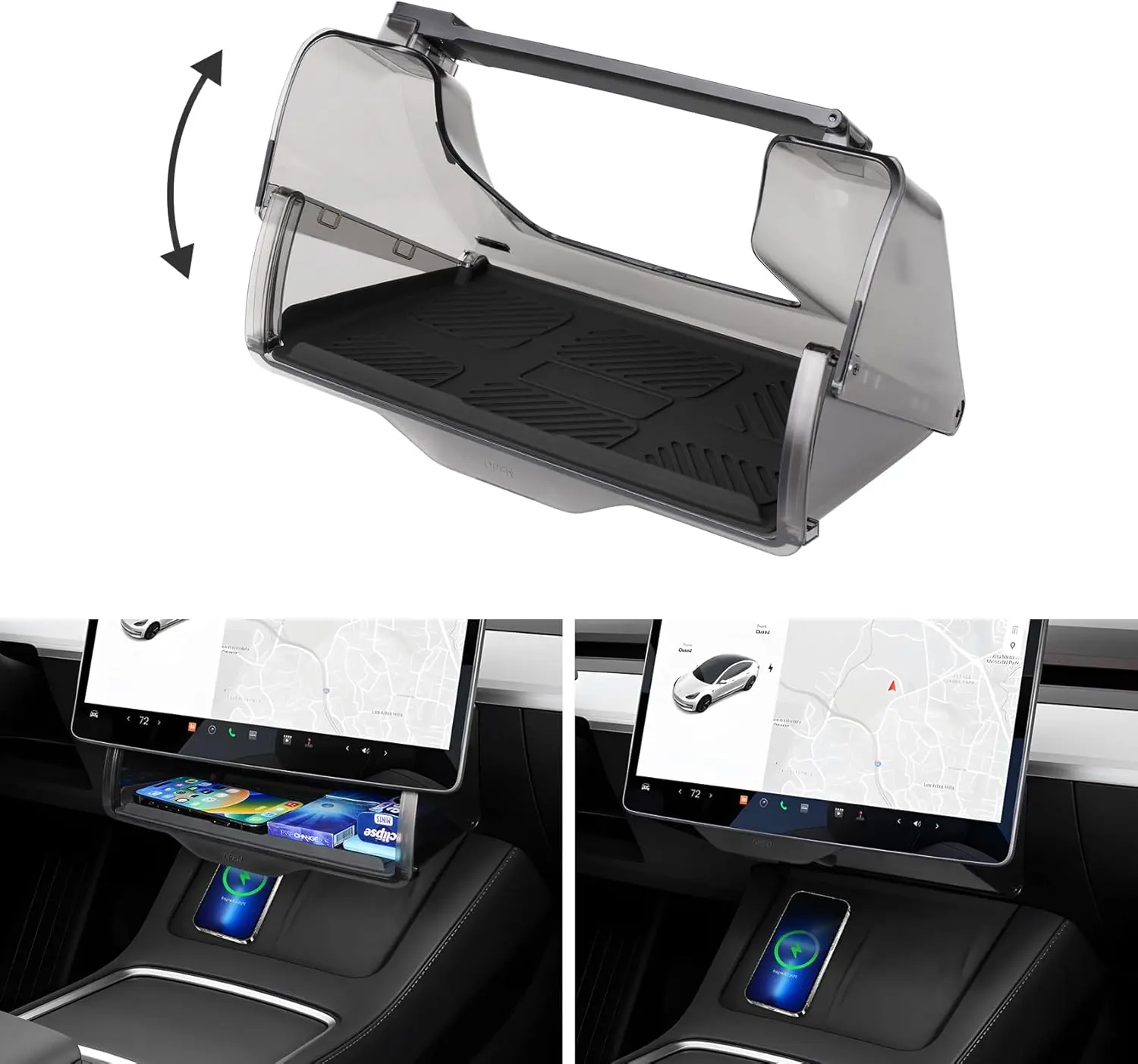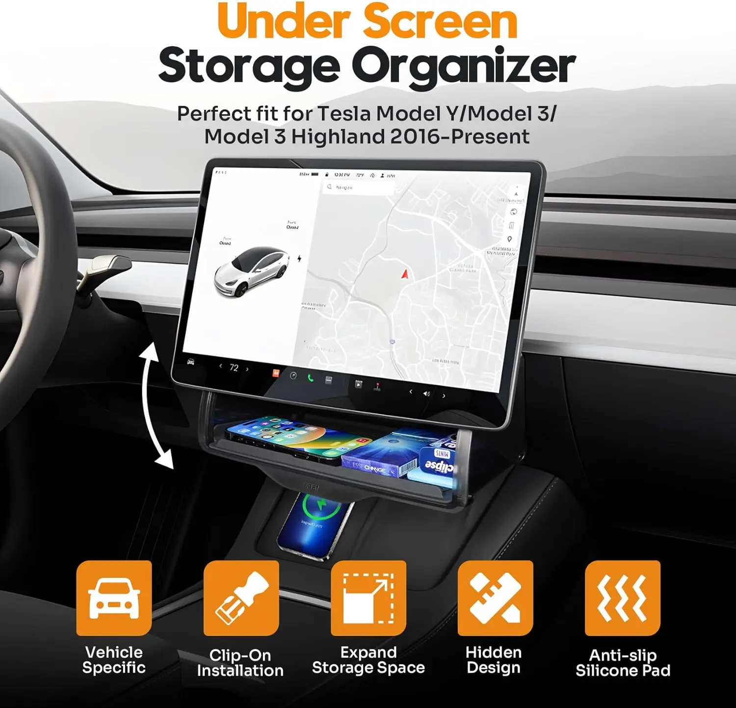 ·【Perfect Fit for Tesla Model 3/Y】Canvcle Under Screen Storage Box perfectly fit for 2020 2021 2022 2023 2024 2025 2026 Tesla Model Y / 2016 2017 2018 2019 2020 2021 2022 2023 2024 2025 2026 Model 3(Fit 2025 2026 New Model Y Juniper/2024 2025 2026 Model 3 Highland). Make full use of the space under Model 3/Y screen without affecting wireless charging. Definitely an essential accessory for your Tesla!