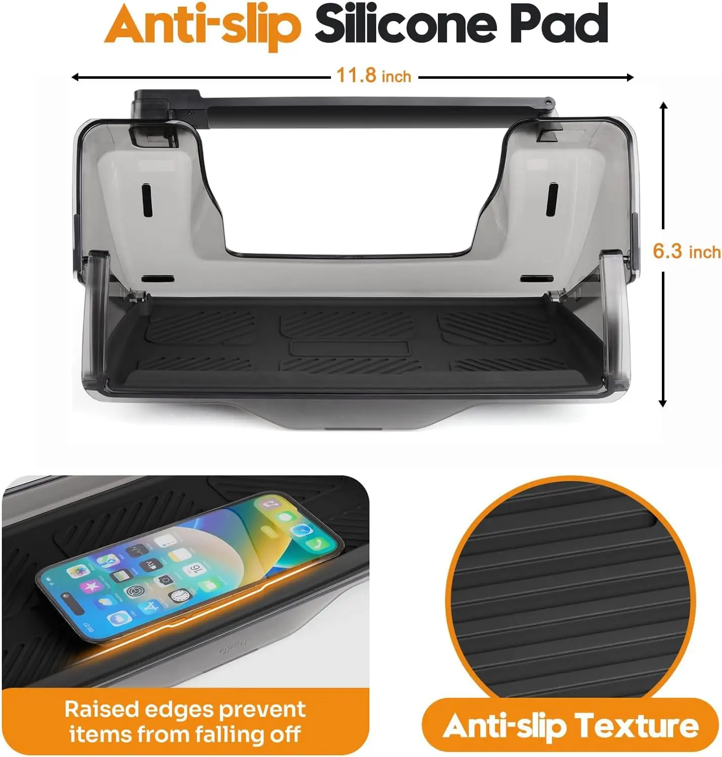 ·【Maximize Storage & Anti-Slip】Our Model 3/Y hidable center console organizer tray provides ample storage space for items like phones, cards, and essentials, keeping your car neat and origanized and providing easy access to your essentials during drives. Equipped with anti-slip silicone pad inside the tray organizer to keep items from shifting during driving.