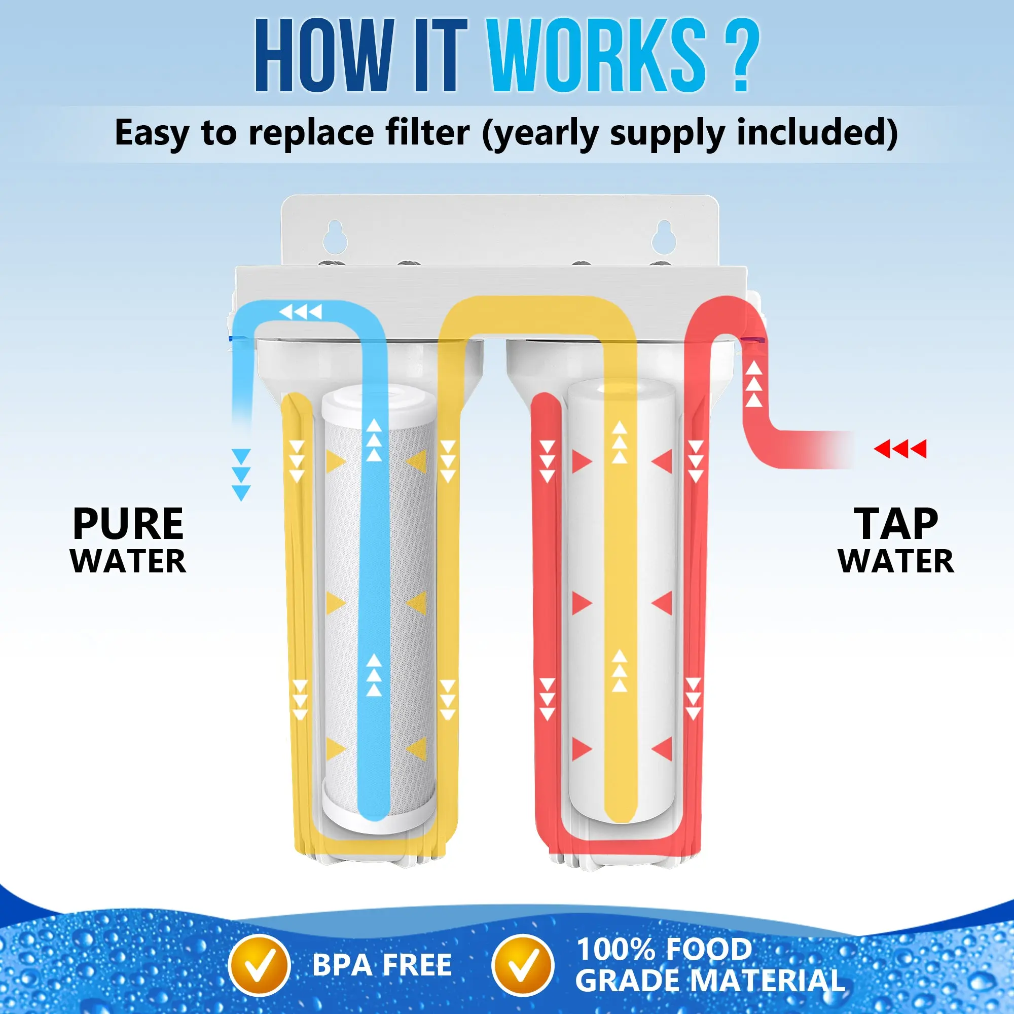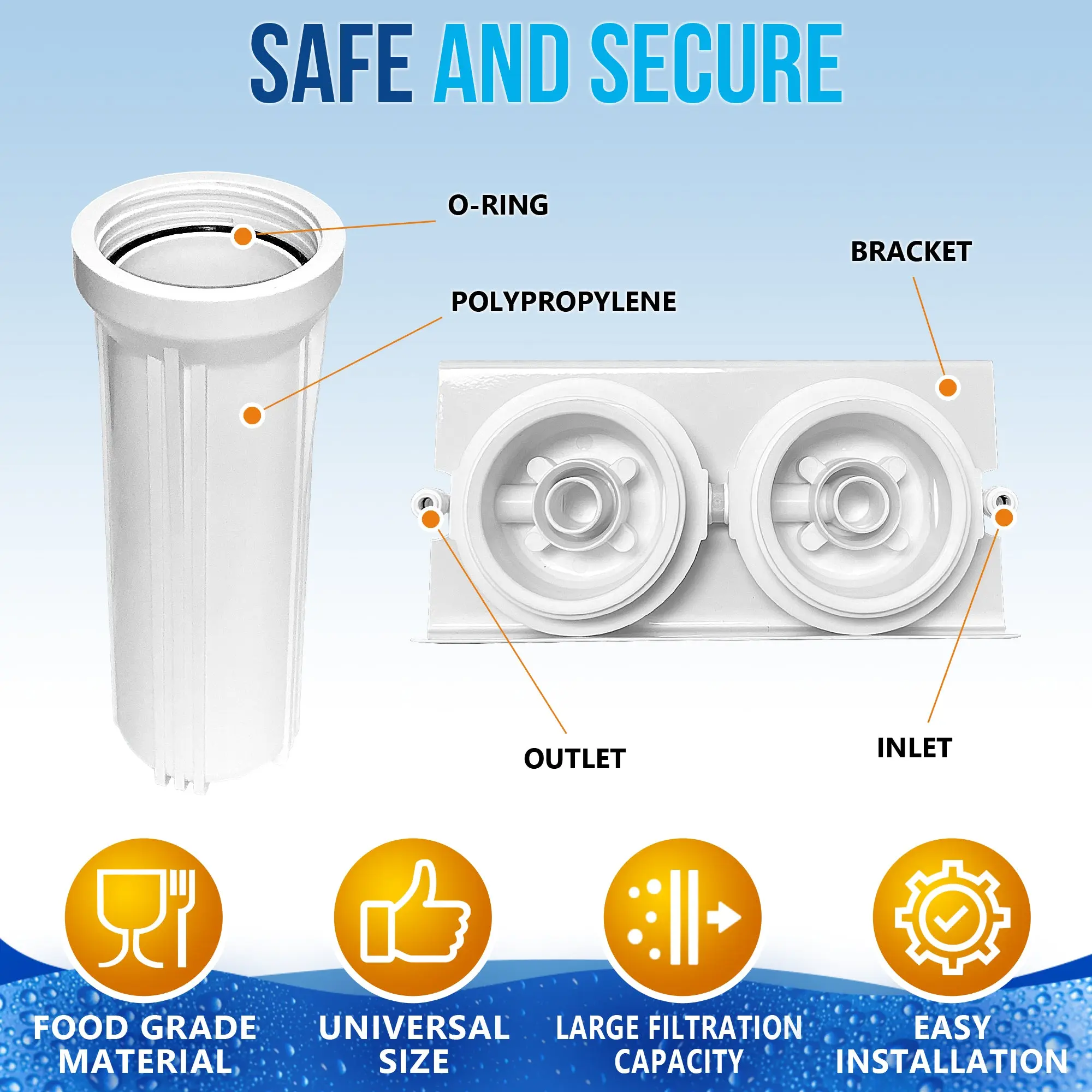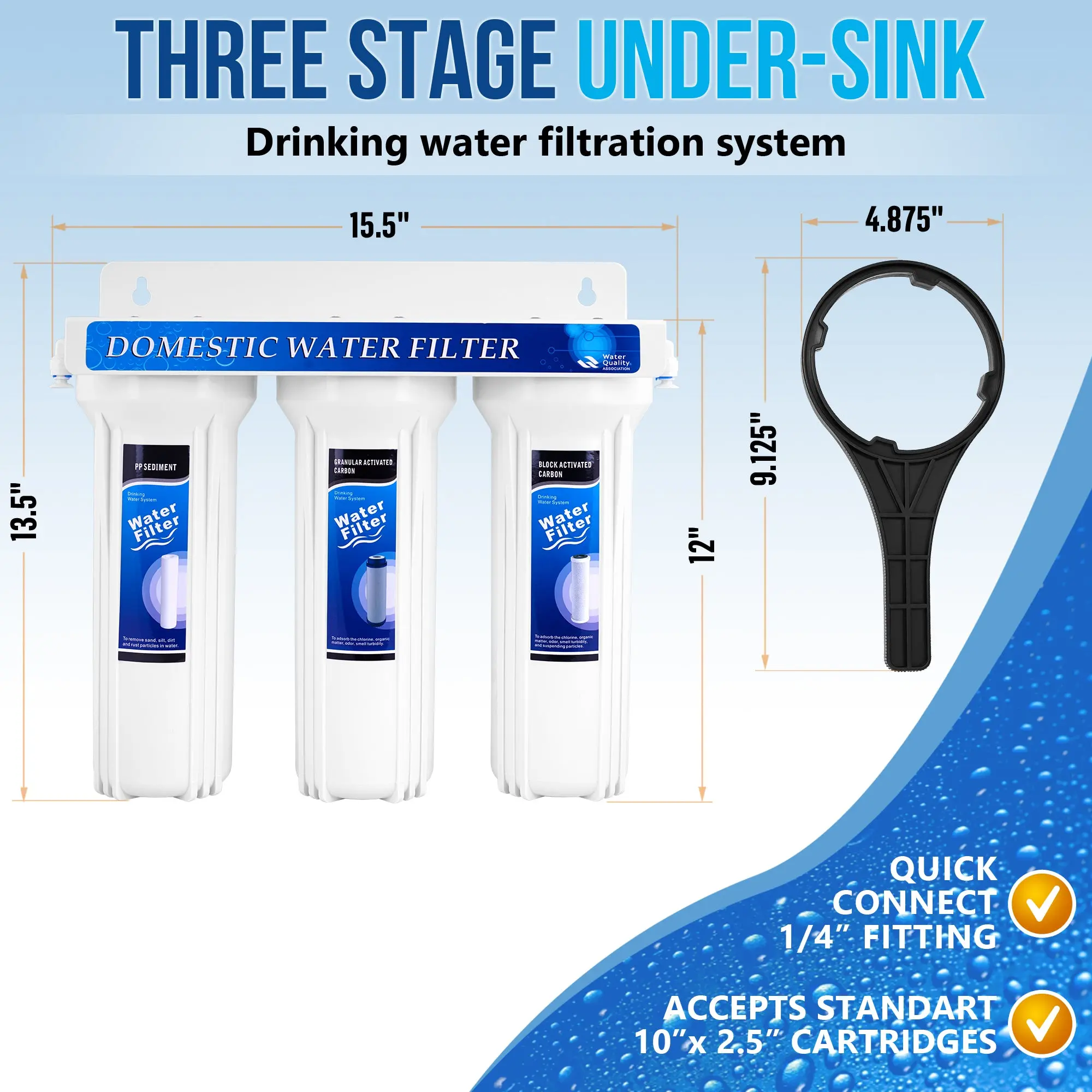·💎 ULTRA-FRESH, DELICIOUS DRINKING WATER AT YOUR HOME - for drinking, cooking; making coffee, tea & baby formula; serving guests, pets & plants; and providing beauty, dietary & health benefits. Reduces up to 99% of contaminants including sediment, scale, rust, dirt, coarse sand, sand, fine sand, extra fine sand, and silt & removes chlorine, odors, particles, and tastes💎 5 MICRON SEDIMENT CARTRIDGE is wrapped and sealed and meets NSF Standards and Regulations. Dimensions: 10” x 2.5”. WELL-MATCHED: PFC5002, DuPont WFPFC5002, 3M CFS110, AP110-NP, AP101S, AP101T, Aqua-Pure AP110, AP11T, AP51T, Hydronix SGC-25-1005, Culligan P5, P5-D, P5A, OmniFilter RS14, RS14-SD, RS14-DS and RS14-SS, GE FXUSC, Aquaboon 25S-5M, Manitowoc K-00173, Whirlpool WHKF-GD05, American Plumber W5P, Pureplus PP10-05💎 5 MICRON BLOCK CARBON CARTRIDGE is wrapped and sealed and meets NSF Standards and Regulations. Dimensions: 9.875” x 2.5”. WELL-MATCHED: Watts Premier MAXETW-975, DuPont WFPFC8002, SCWH-5, Whirlpool WHA2BF5, Water Filter Tree WWC105, GE FXWTC, WFD WF-CB105, Culligan D-10A & D-10, EcoPure EPW2C, Aquaboon CTO, Purenex C-5M, Neo-Pure CTO1-2510, COR10B5, KleenWater KWGE25RG, WFDWC30001, Omnipure OMB934-5M, WFPFC9001, Everpure CG5-10, DEV9108-15, iSpring FC15💎 QUICK-CONNECT FITTINGS MAKE FOR FAST, EASY INSTALLATION. A 1/2-Inch hole is all that is needed for the faucet stud (all series), but a cover plate is included to accommodate larger pre-drilled holes💎 DRIP-FREE PERFORMANCE CHROME FAUCET and WELL-MATCHED following Models: Purenex GF-01C, Aquaboon 8541997846, Watts Pureteck 116023, iSpring GB1, HOMEWORKS 3310-160-CH-B-Z, Crystal Clear GF-01C, Hydronix LF-BLR-BNUnder sink One Stage Water Filter System (US-2) is suitable for homes, apartments, schools, hotels, restaurants,s and anywhere there is a faucet connection. Is ideal for kitchens with limited under-sink cupboard space. This system (RA-US-2) features a 5-micron sediment pre-filter to remove sand rust and sediment and high performance 5 Micron Coconut Shell Carbon Block Filter. Quick-Connect fittings make installation a snap. A 1/2-Inch hole is all that is needed for the faucet stud (all series), but a cover plate is included to accommodate larger pre-drilled holes.The US-2 accepts all standard 10-inch replacement filter elements. So when it's time for a new filter, you can rest assured that you'll find all the right parts.The Importance of Drinking Clean Water: Water is critical to proper food digestion, kidney health, brain function, blood health, joint functionality, and more. It's important to make sure that the water you drink is devoid of contaminants. Thankfully, using a Ronaqua water filtration device will ensure consistent quality for all of your drinking and cooking needs. In fact, when you use Ronaqua water treatment devices and filters, your water will be free of chlorine taste and odors, particles, and many other contaminants that can be detrimental to your health.Product Features: Built-in wall bracketCompact design, Space-efficient5 Micron Sediment 10”x 2.5” Plus 3 extra Cartridges5 Micron Block Activated Carbon 9.875”x 2.5 Plus 2 extra CartridgesHousing WrenchStandard Faucet spout chrome