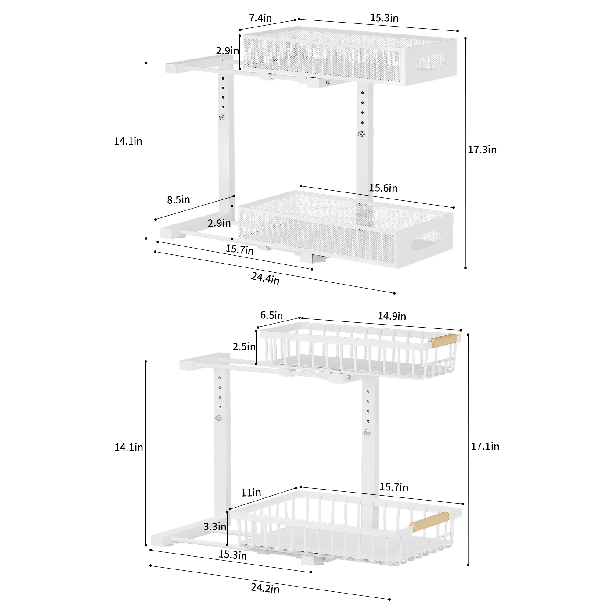 2 Pack Under Sink Organizer,Adjustable Height,2 Tier Pull Out Under Cabinet Organizer,Slide Out Thickened Metal Under Sink Storage for Kitchen Bathroom Laundry Cabinet Pantry,White,black Shelf Rack Racks