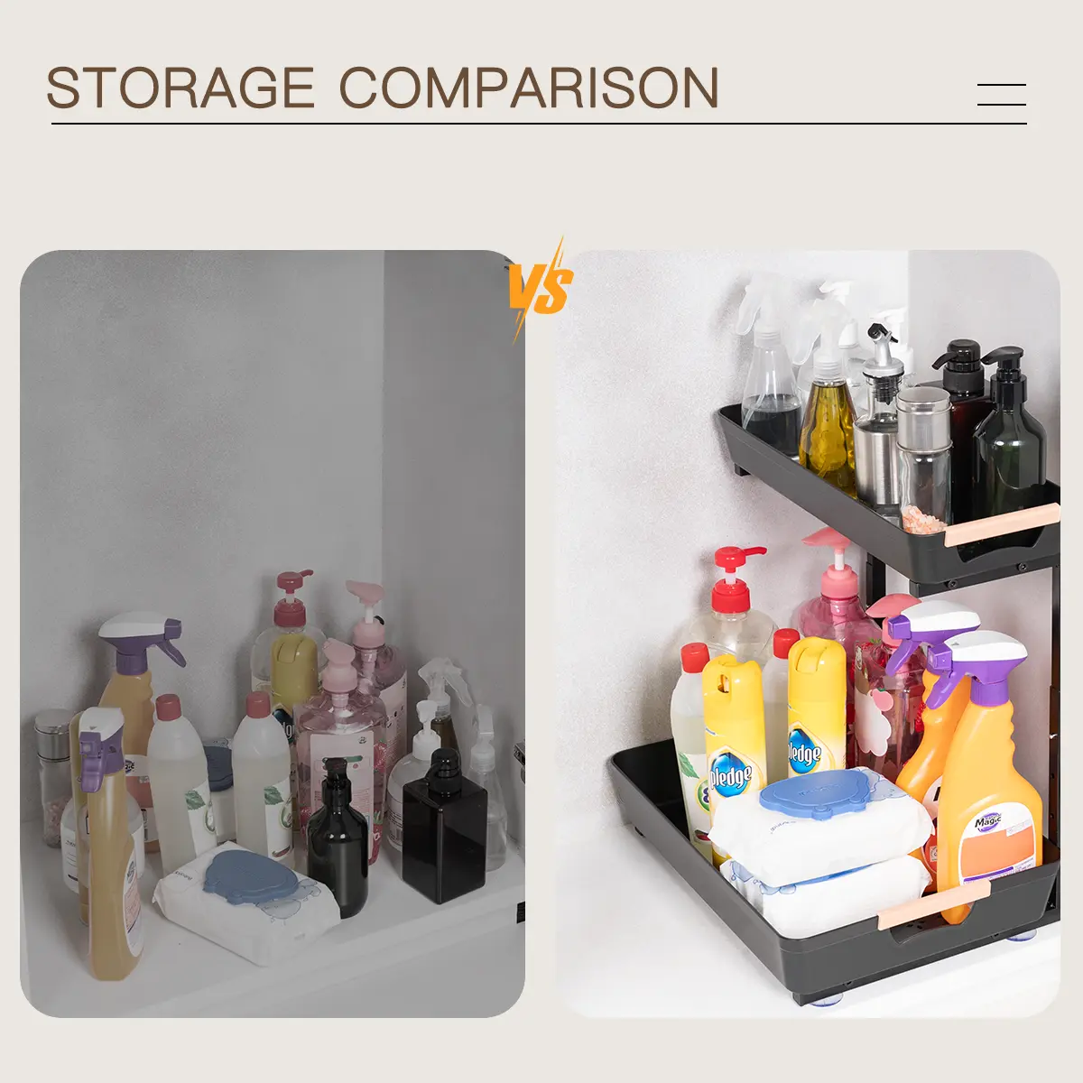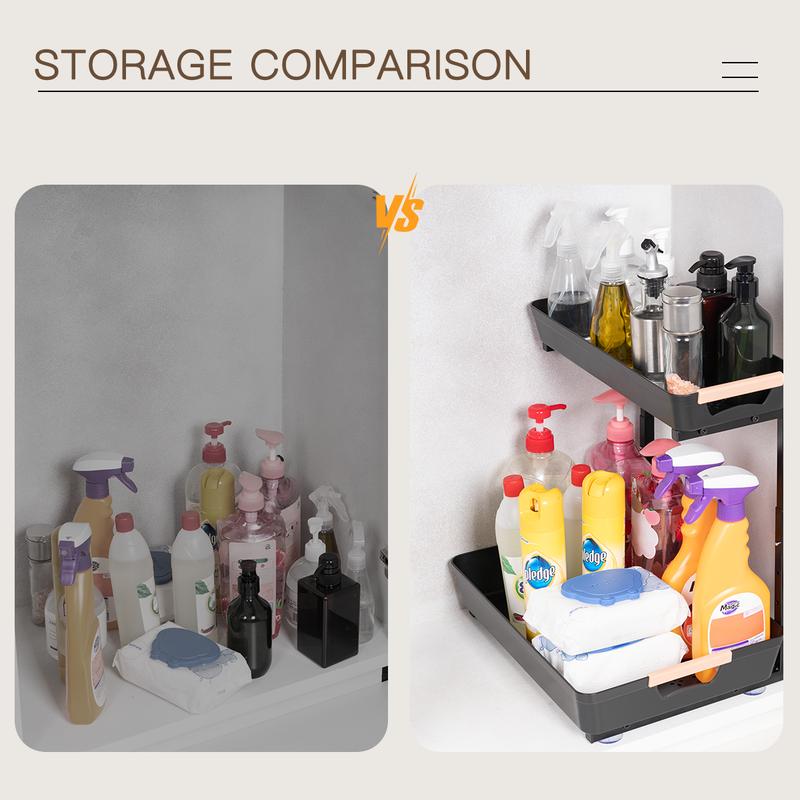·【2-Tier Sliding Basket】 This pull-out cabinet organizer features a unique design, with both upper and lower baskets that can be pulled out, making it easier for you to access items stored beneath the sink.