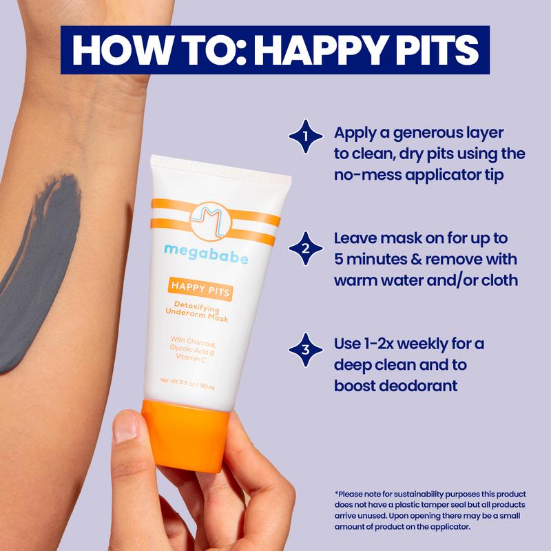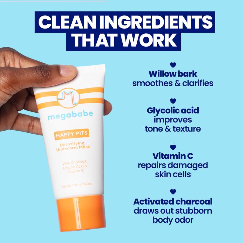 Happy Pits Underarm Detoxifying Mask is powered by charcoal and kaolin clay to draw out stubborn stink and impurities. Glycolic acid, willow bark and tea tree clear away dead skin cells and reduce underarm bumps, while vitamin C brightens.