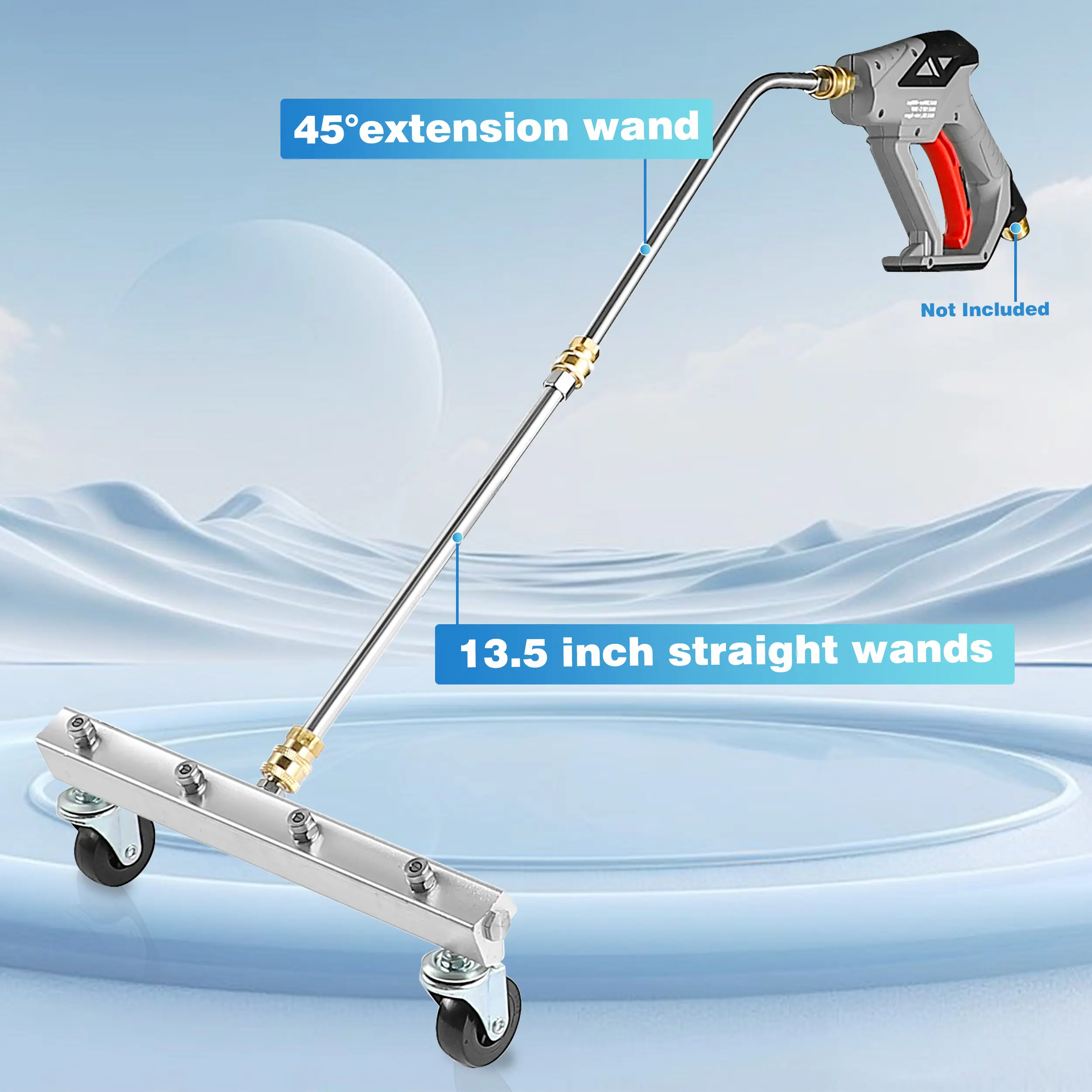 ·Package List: 13’’ undercar cleaner, 13.5’’ straight extension wand, 14.5’’ 45 degree curved wand. The under car washer works for hot and cold water power washer. It has 4 nozzles and 2 casters.