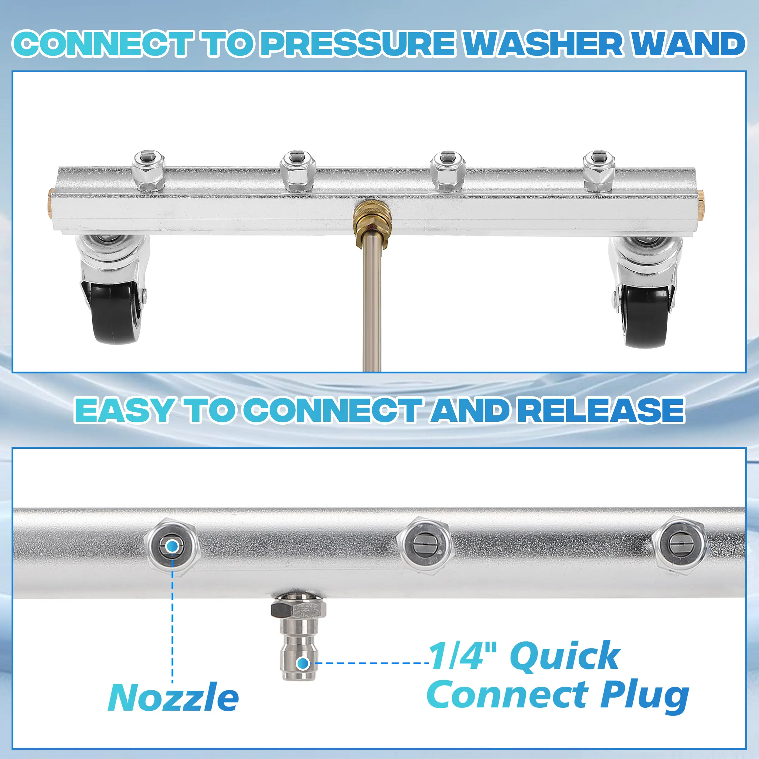 ·How to set up: Quick connect straight wand to undercarriage cleaner. Than quick connect angled wand to the straight wand. Than quick connect your long trigger handheld to angled wand. Finally, control your trigger handheld to pull two wands into the bottom of your car.