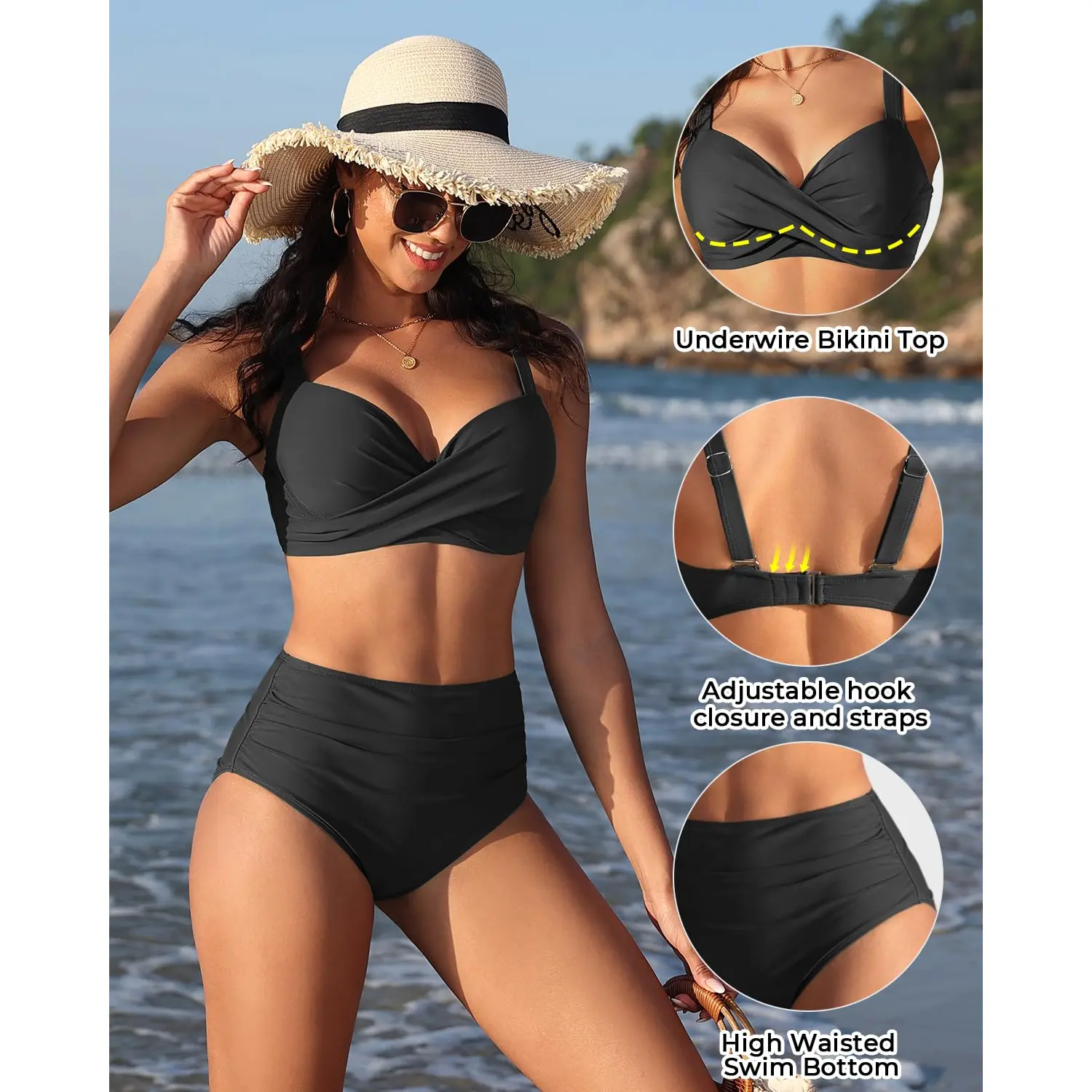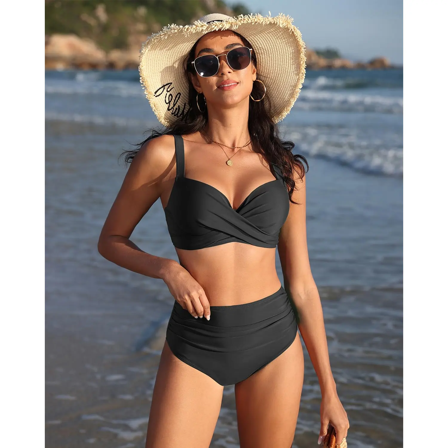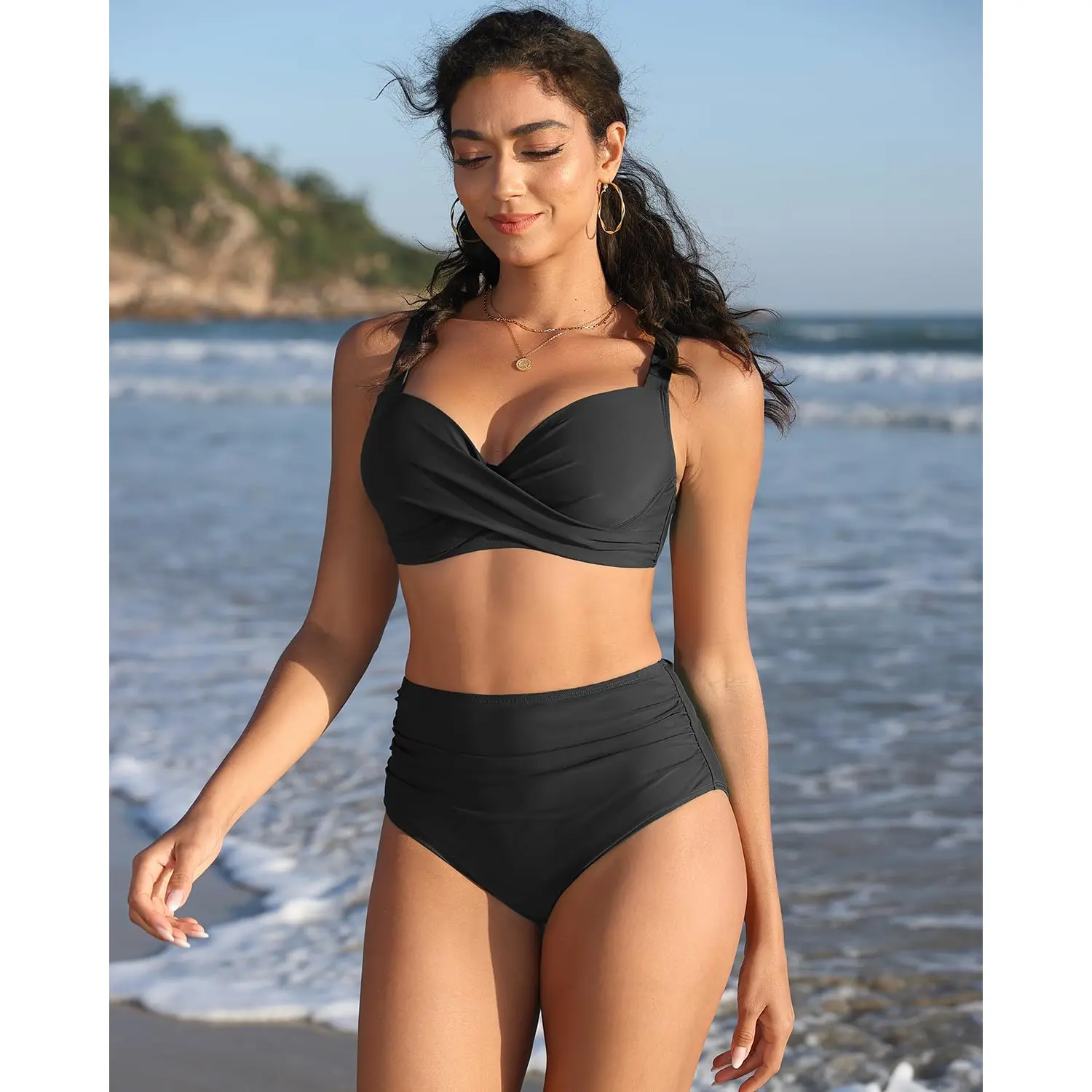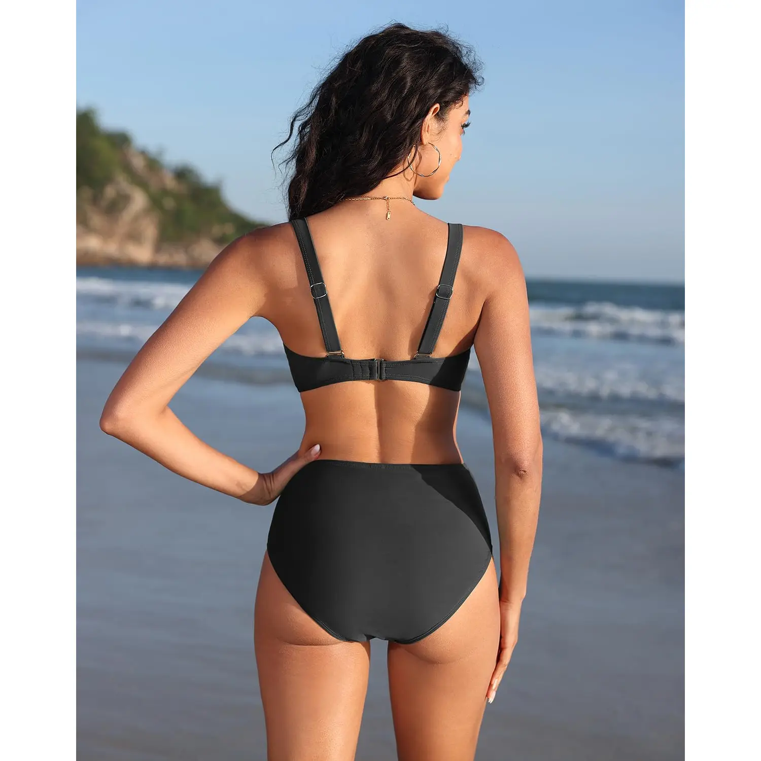 ·High-Waisted Tummy Control Swimsuit: This two piece bathing suit features a high-waisted swim bottom with a ruched design, offering tummy control, full coverage, and a flattering figure-enhancing fit.