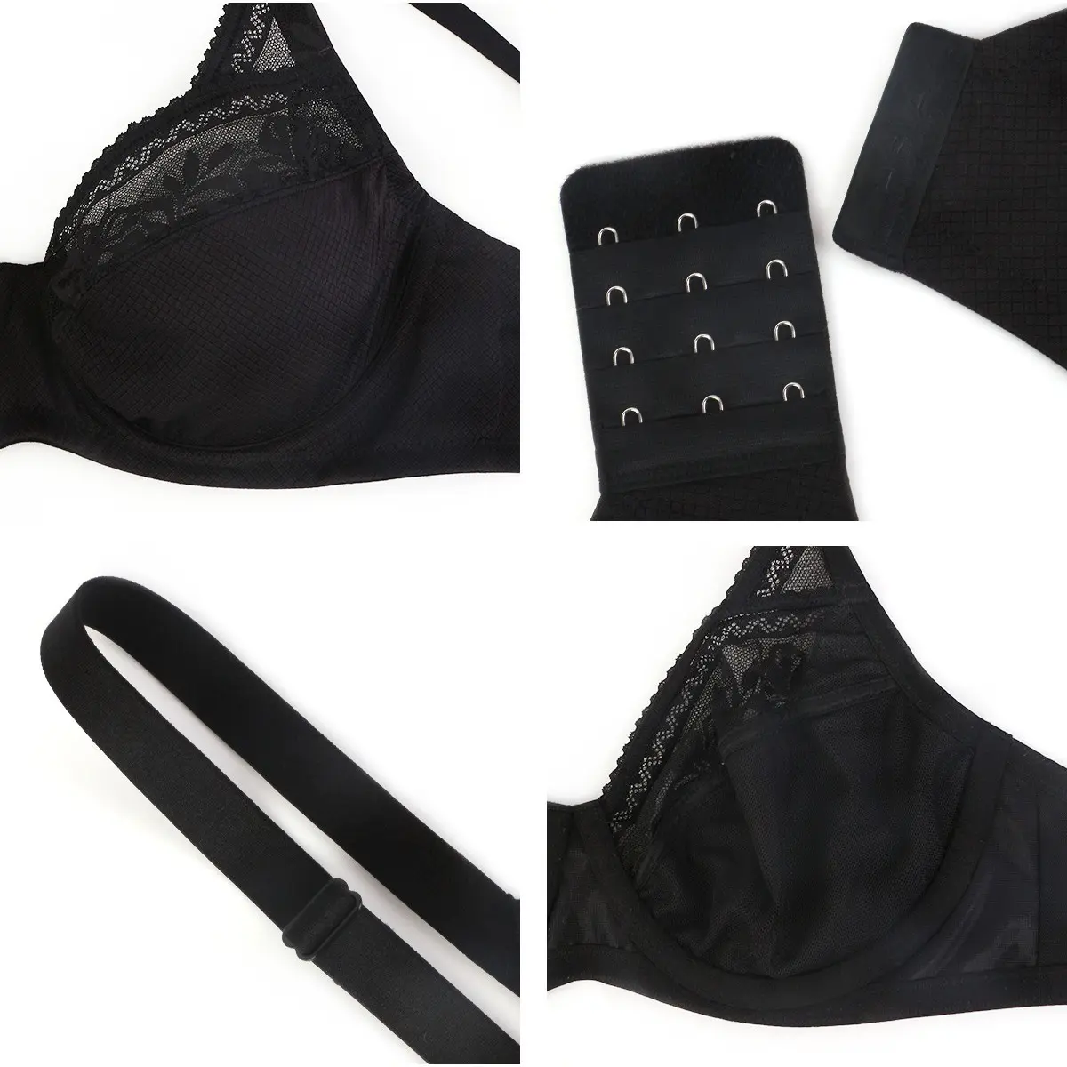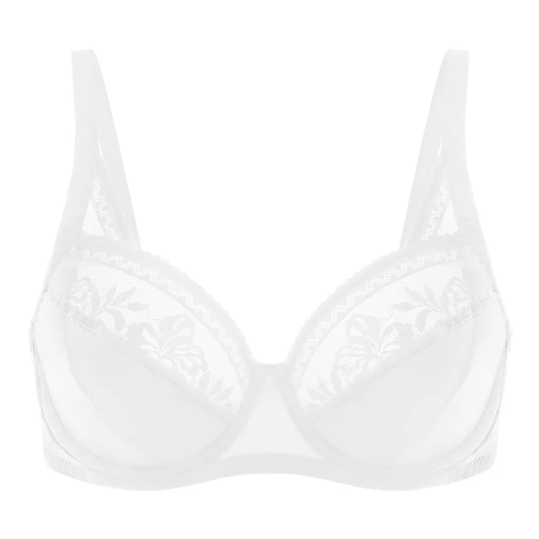 The upper cup features delicate sheer lace for a romantic touch. The lower cup combines a textured grid fabric with lace for structured elegance.