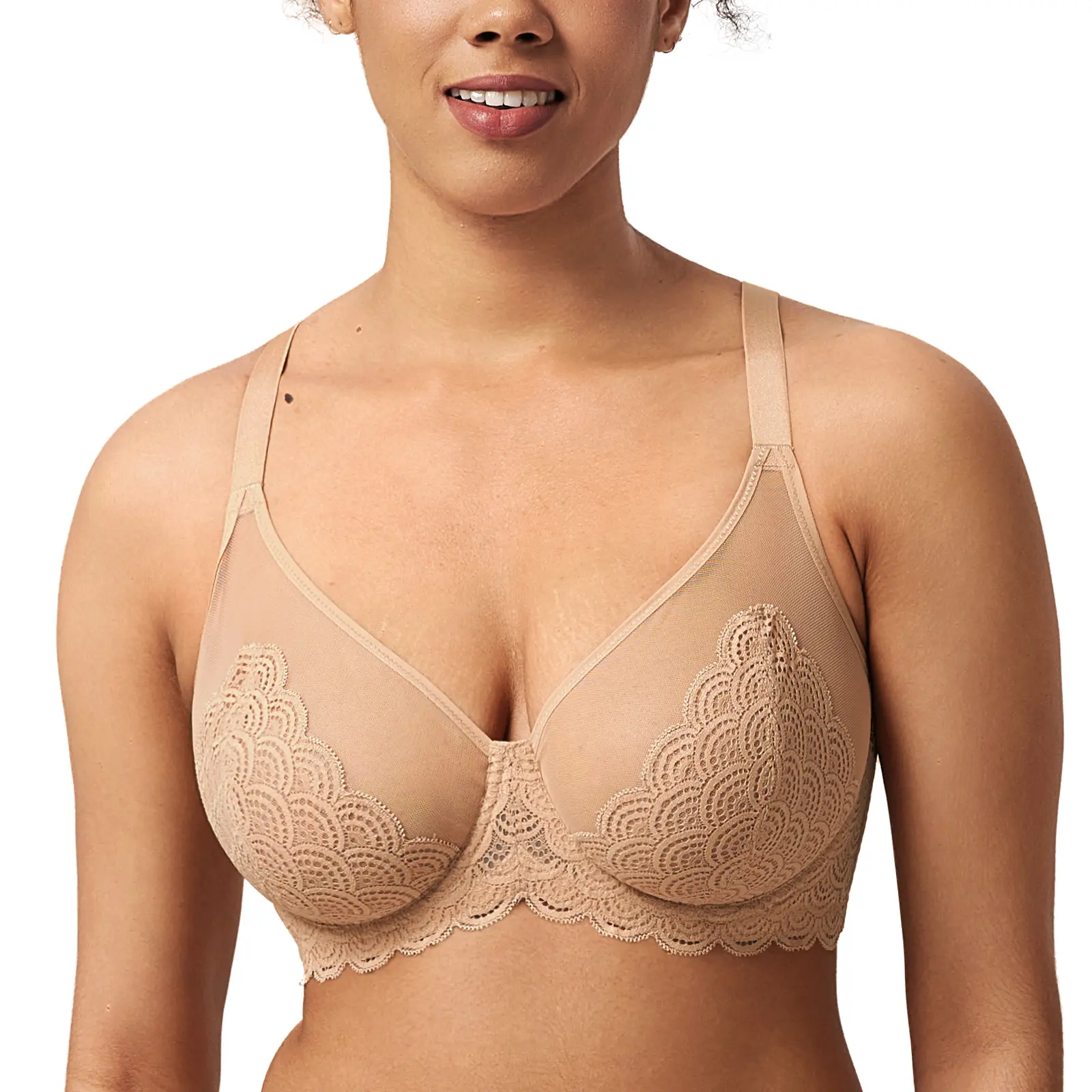 Our Mermaid Scales Unlined Bra is specifically designed for fuller busts. It features non-stretch lace and breathable mesh to provide a visual slimming effect that looks smooth under any outfit.