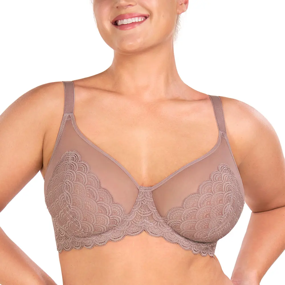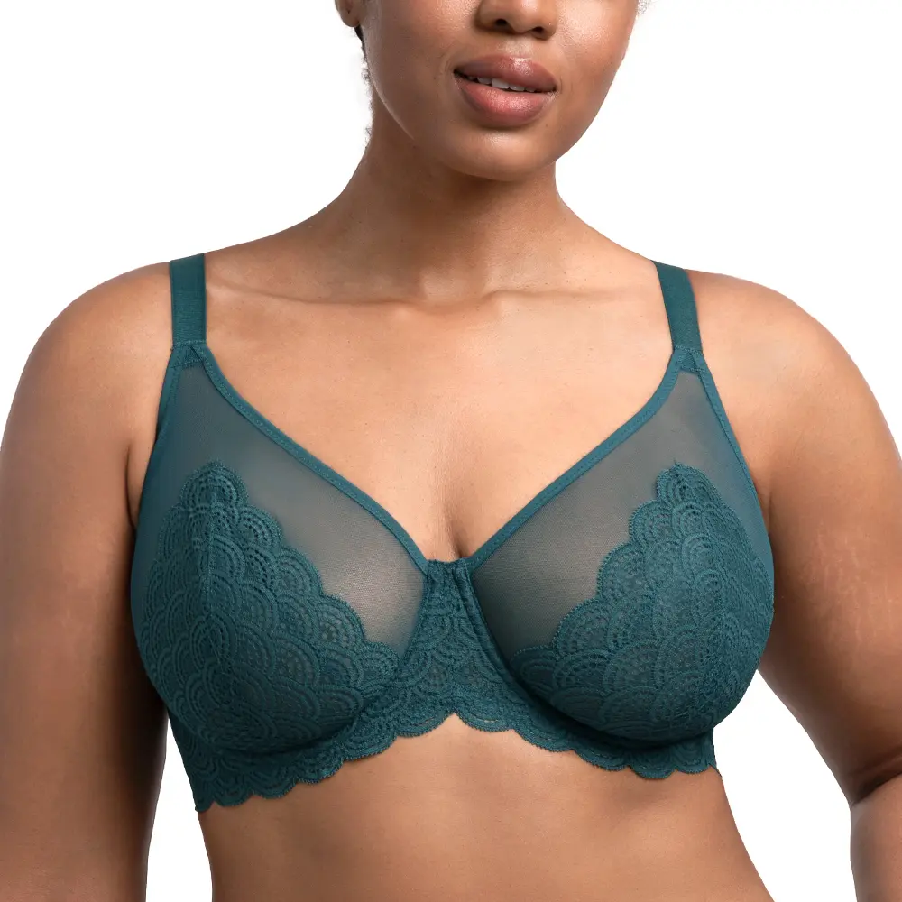 Our Mermaid Scales Unlined Bra is specifically designed for fuller busts. It features non-stretch lace and breathable mesh to provide a visual slimming effect that looks smooth under any outfit.