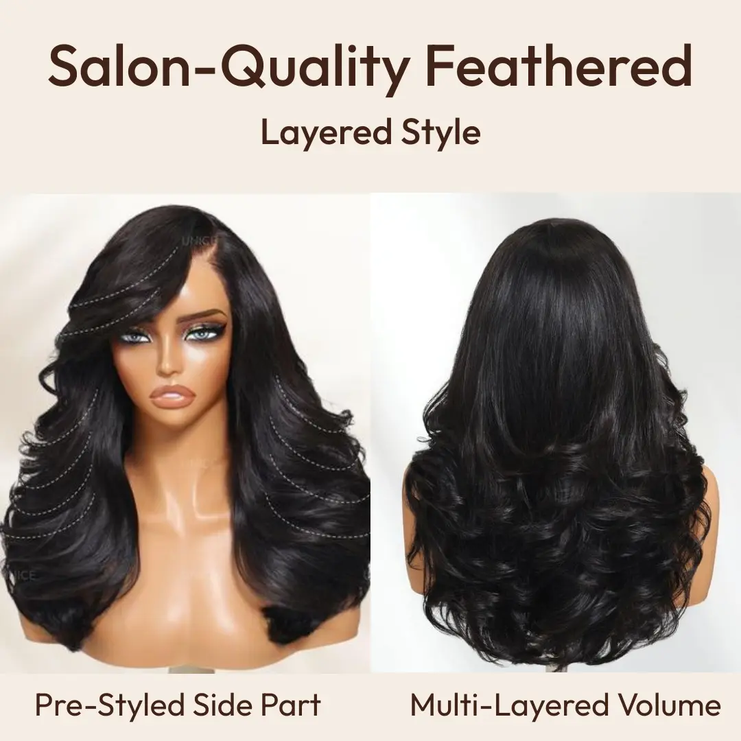 UNice Glueless Bye-Bye Slip Layer Side Part Body Wave Wig 7x5 HD Lace Closure Human Hair Wig Feathered with Secure Silicone Strips and Drawstring Put On and Go Beginners Friendly Natural Scalp
