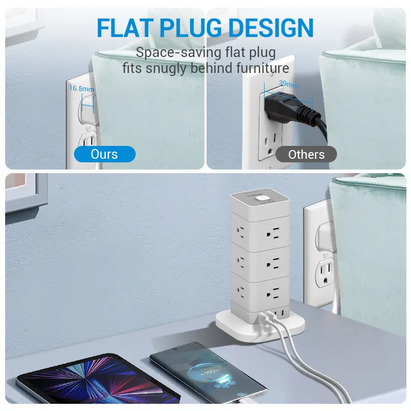 ·Space-Saving Vertical Design: This power strip is designed to optimize space while delivering maximum power. The sleek, vertical design and compact flat plug make it a practical electrical tower solution for maximizing limited spaces while keeping cords tangle-free.