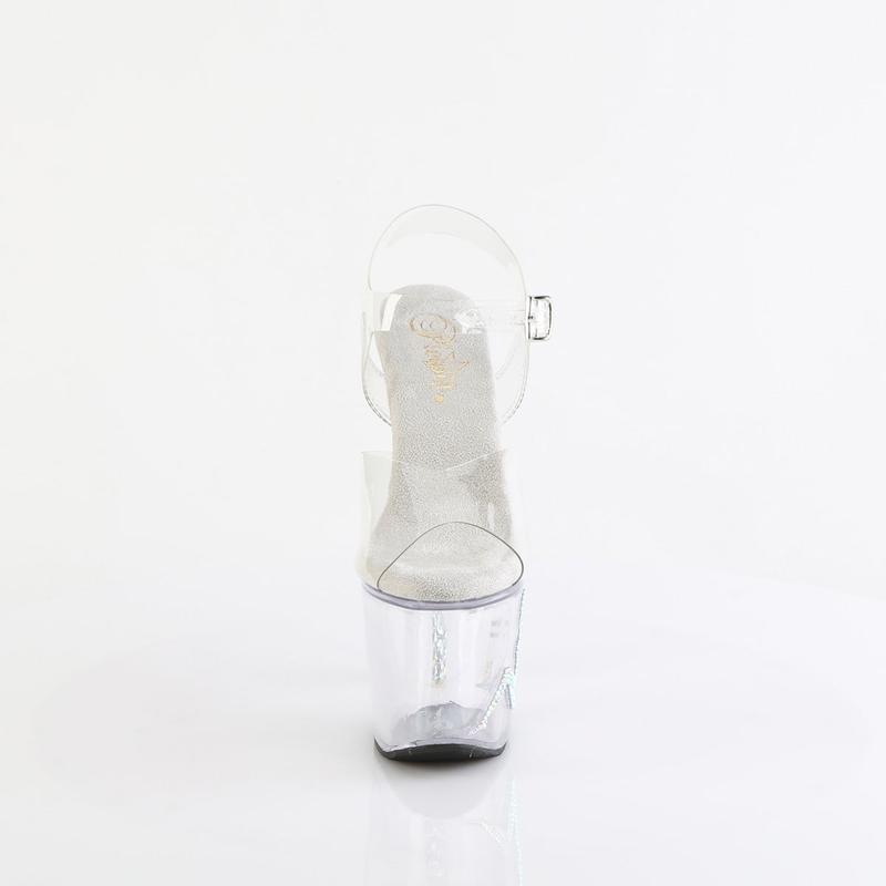 Step into a world of fantasy with the Unicorn-708TGRS ankle strap sandals. These unique shoes feature a striking 7-inch unicorn heel and a 3 1/4-inch platform, elegantly adorned with spiral AB rhinestones. The eye-catching trucker girl silhouette on the outer side of the platform adds a playful touch. Crafted to blend style with a hint of whimsy, these clear sandals are a fabulous choice for those who love to stand out in a crowd.