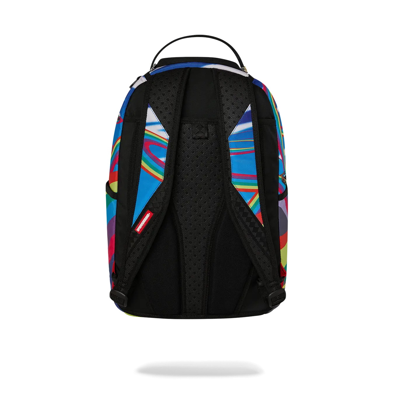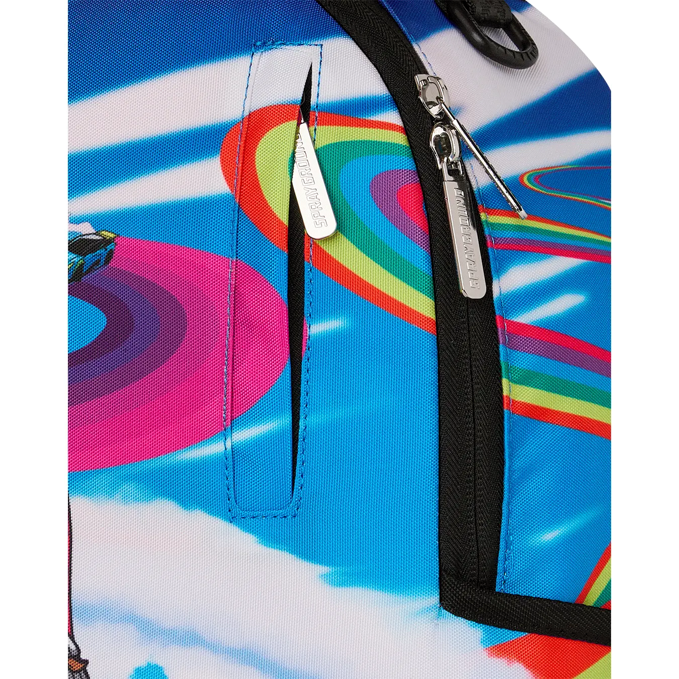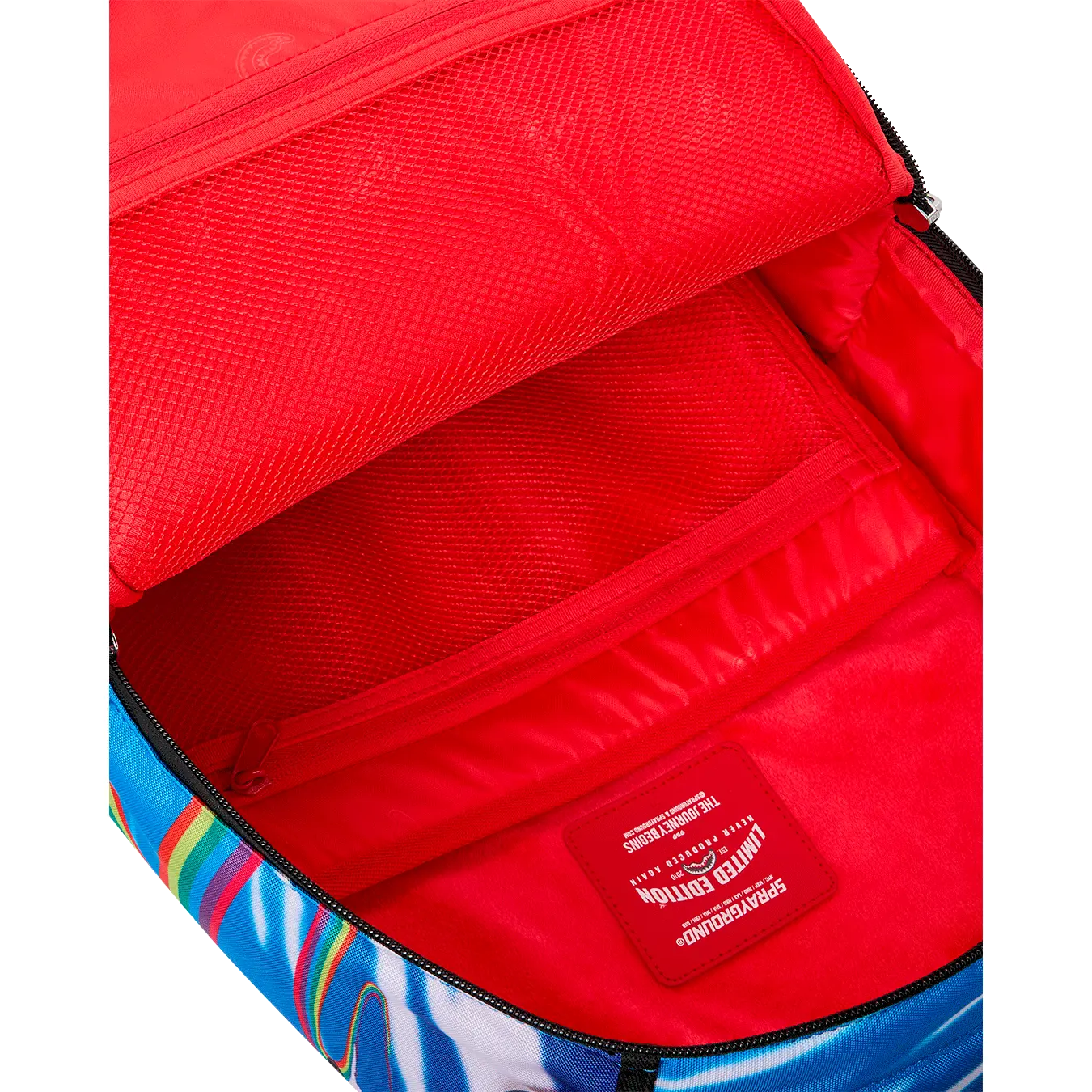 Dimensions: 18" x 6" x 11.5" • Front zipper pocket • Side pockets • Zippered Stash pocket • Separate velour sunglass compartment • Ergonomic mesh back padding • Adjustable Straps for custom sizing • Gold zippers with metal hardware • Metal "Sprayground Authentic" badge • Slide through back sleeve connects to carry-on luggage to free your hands
