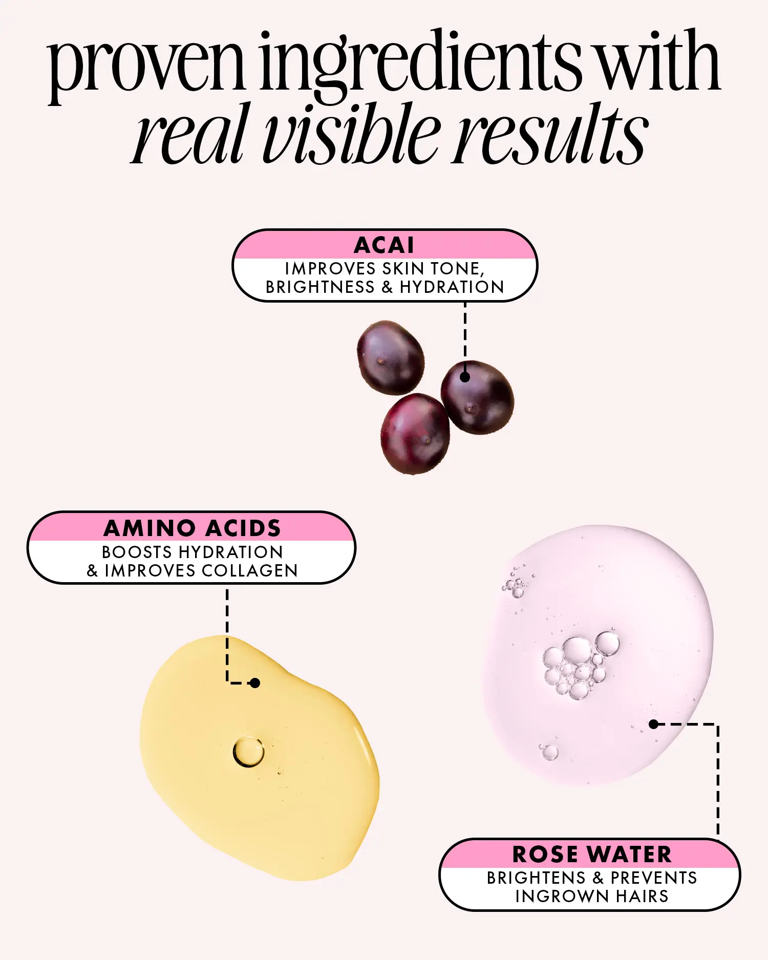 ·Acai - Rich in antioxidants like vitamin C, acai improves skin tone and brightness while deeply hydrating and soothing inflammation with its essential fatty acids.