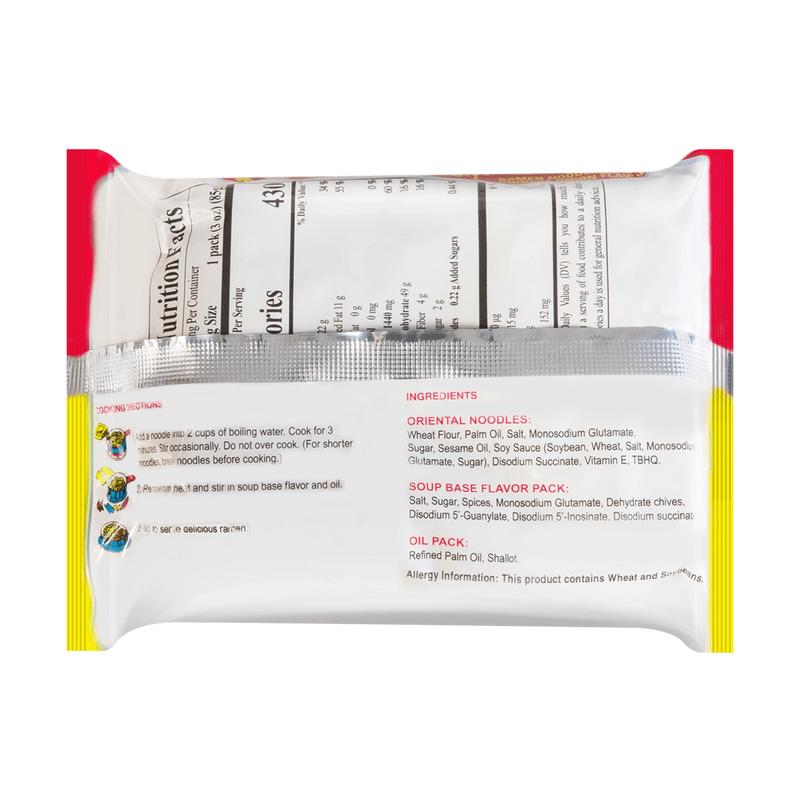 ·Oriental Noodles: Wheat Flour, Refined Palm Oil, Salt, Monosodium Glutamate, Sugar, Sesame Oil, Guar Gum, Soy Sauce (Soybean, Wheat, Salt, Alcohol), Potassium Carbonate, Sodium Carbonate, Sodium Polyphospate, Pentasodium Triphosphate, Disodium Succinate, Disodium 5'-Guanylate, Disodium 5'- Inosinate, Citric Acid, Tocopherols. Soup Base Flavor Pack: Salt, Sugar, Monosodium Glutamate, Pepper Powder, Dehydrated Green Onion, Artificial Garlic Powder, Disodium Succinate, Disodium 5'- Guanylate, Disoidum 5'-Inosinate, Bonito Powder, Artificial Flavors (Soybean, Wheat, Lactose, Disodium 5'-Inosinate, Disodium 5'-Guanylate, Monosodium Glutamate, Salt, Silicon Dioxide), Soybean Oil. Oil Pack!: Refined Palm Oil, Shallot, Tocopherols