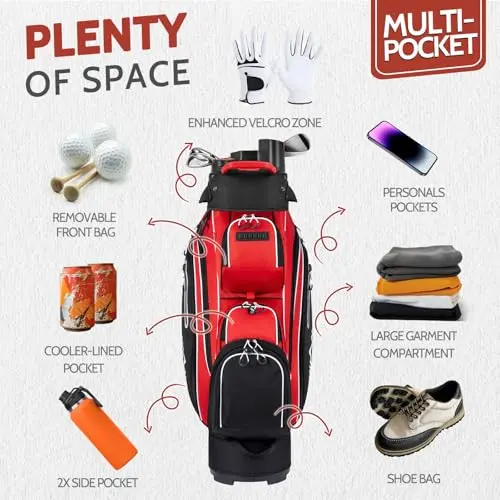 【Ample Storage】:With multiple pockets, including a spacious apparel pocket, cooler pocket, valuables pocket, and more. The movable and detachable pockets provide customizable storage space for your golf essentials, snacks, beverages, and personal items