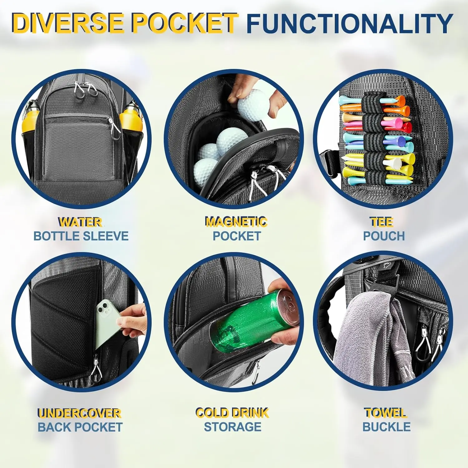 【LARGE POCKETS SPACE】The golf bag with multiple pockets. Including large side pockets, a lined valuables pocket, front-sided magnetic pocket for ball storage and cooler pocket. Roomy enough to hold everything you need on the golf course