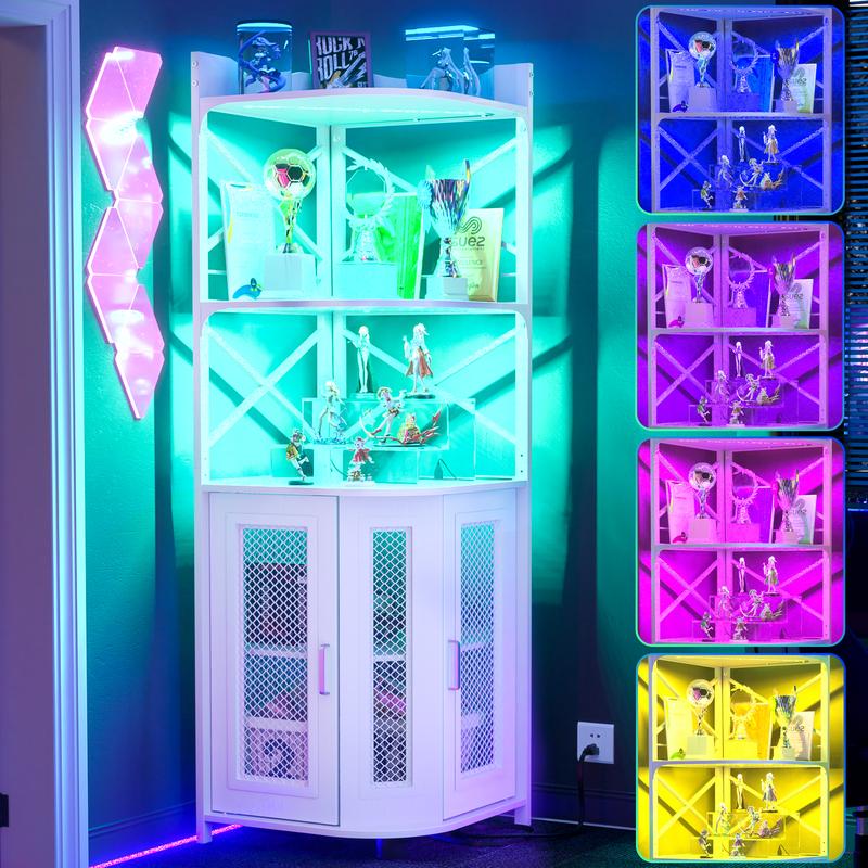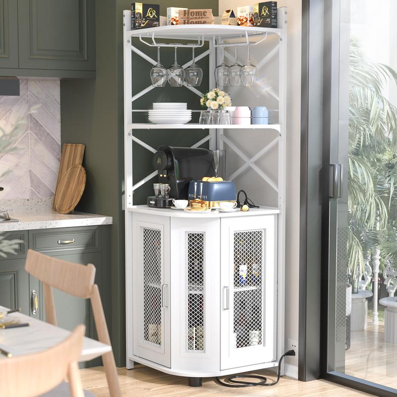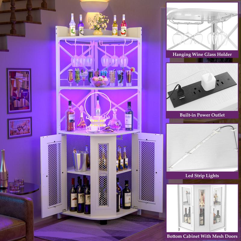 This freestanding corner bar cabinet maximizes unused space while providing smart charging capabilities and vibrant lighting effects. The industrial design offers both functionality and style, with ample storage for bar essentials and home items.