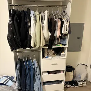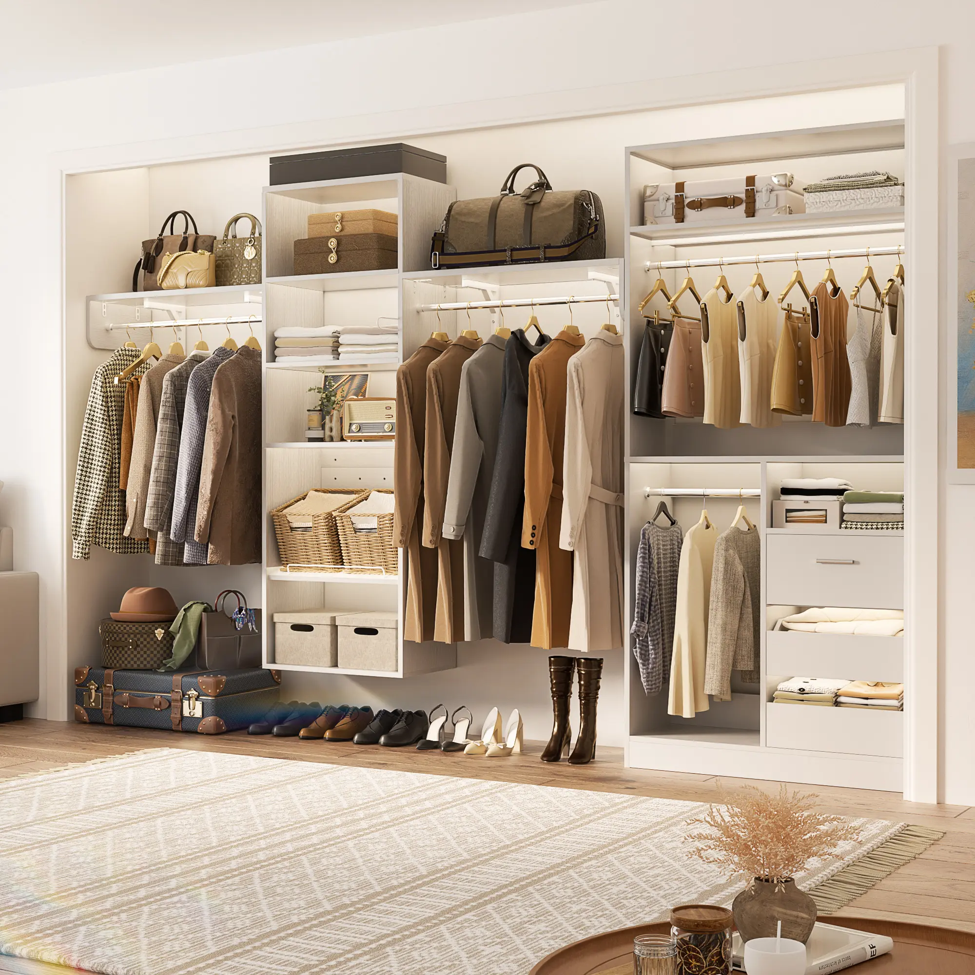 ·Middle Partitioned AreaOne side continues the hanging function to meet more clothing - hanging needs.The other side has drawers and open compartments. Drawers are ideal for small items like underwear and socks, while open compartments are great for storing frequently - used bags, enabling handy access and display.
