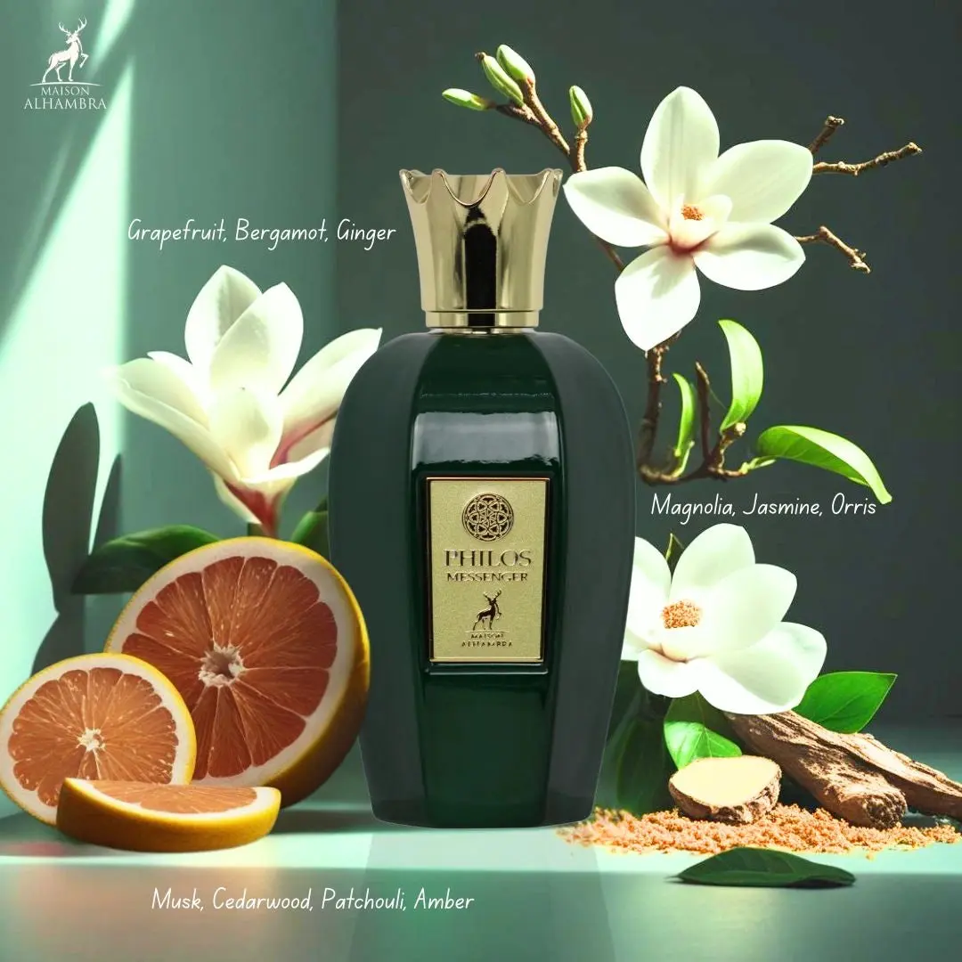 Philos Messenger by Maison Alhambra is a vibrant and refined unisex fragrance that opens with a bright, energetic trio of grapefruit, bergamot, and ginger—zesty and slightly spicy for an immediate burst of freshness. The heart reveals a sophisticated floral blend of magnolia, jasmine, and soft orris, adding an elegant, creamy dimension that gently balances the sparkling top notes.