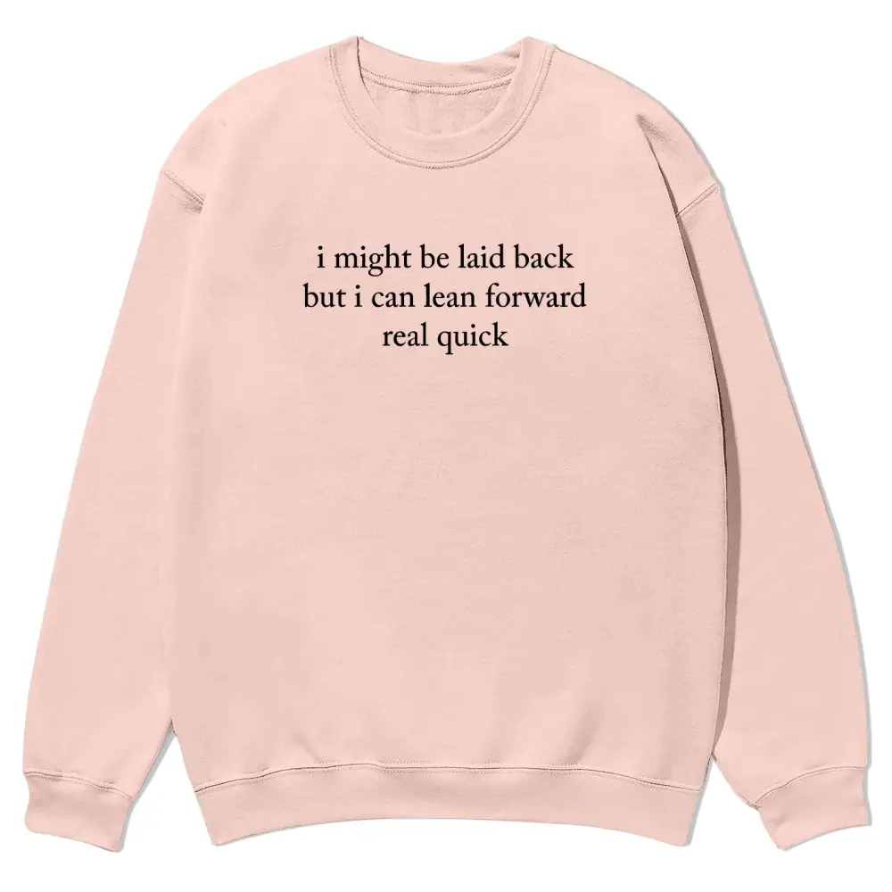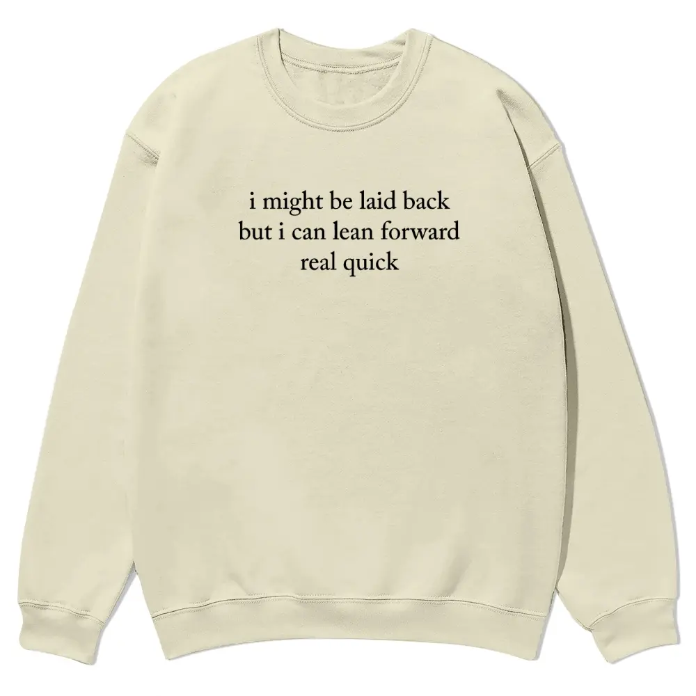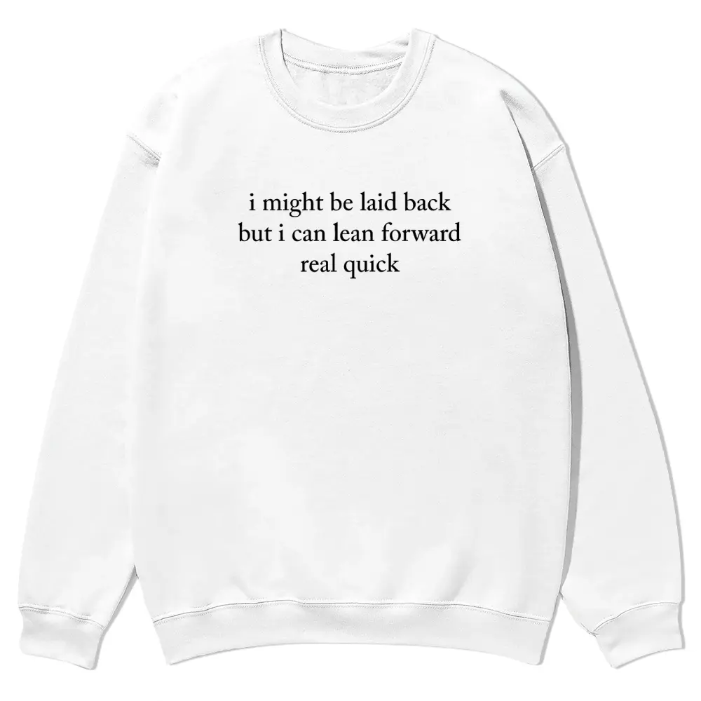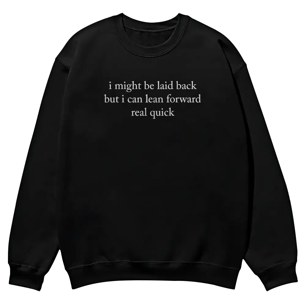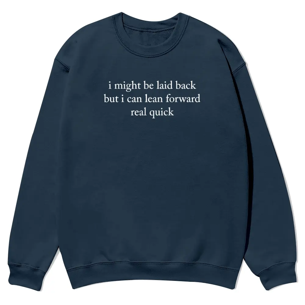 I Might Be Laid Back But I Can Lean Forward Real Quick crewnecks for men and women, full color fall sweatshirts, fun and cozy patterned sweaters, unisex fall clothing