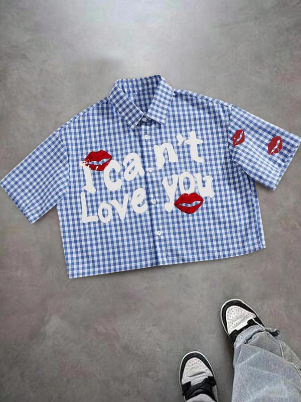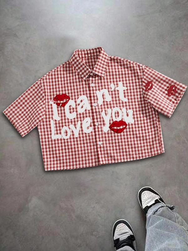Unisex casual streetwear style "I can't Love you" red lip print plaid shirt, Y2K streetwear cropped top, suitable for streetwear, Y2K outfits, men's gifts, couple outfits, high street culture.
