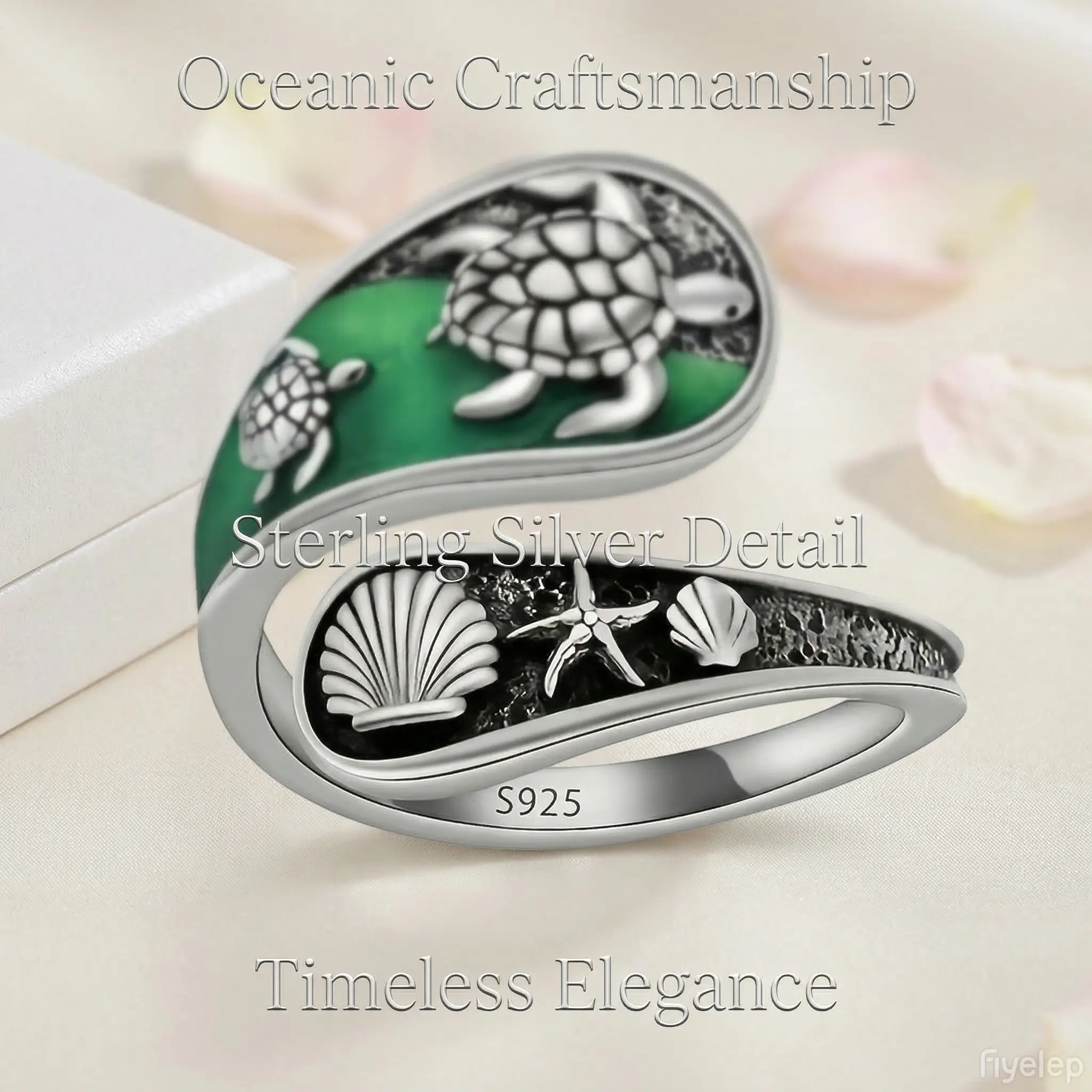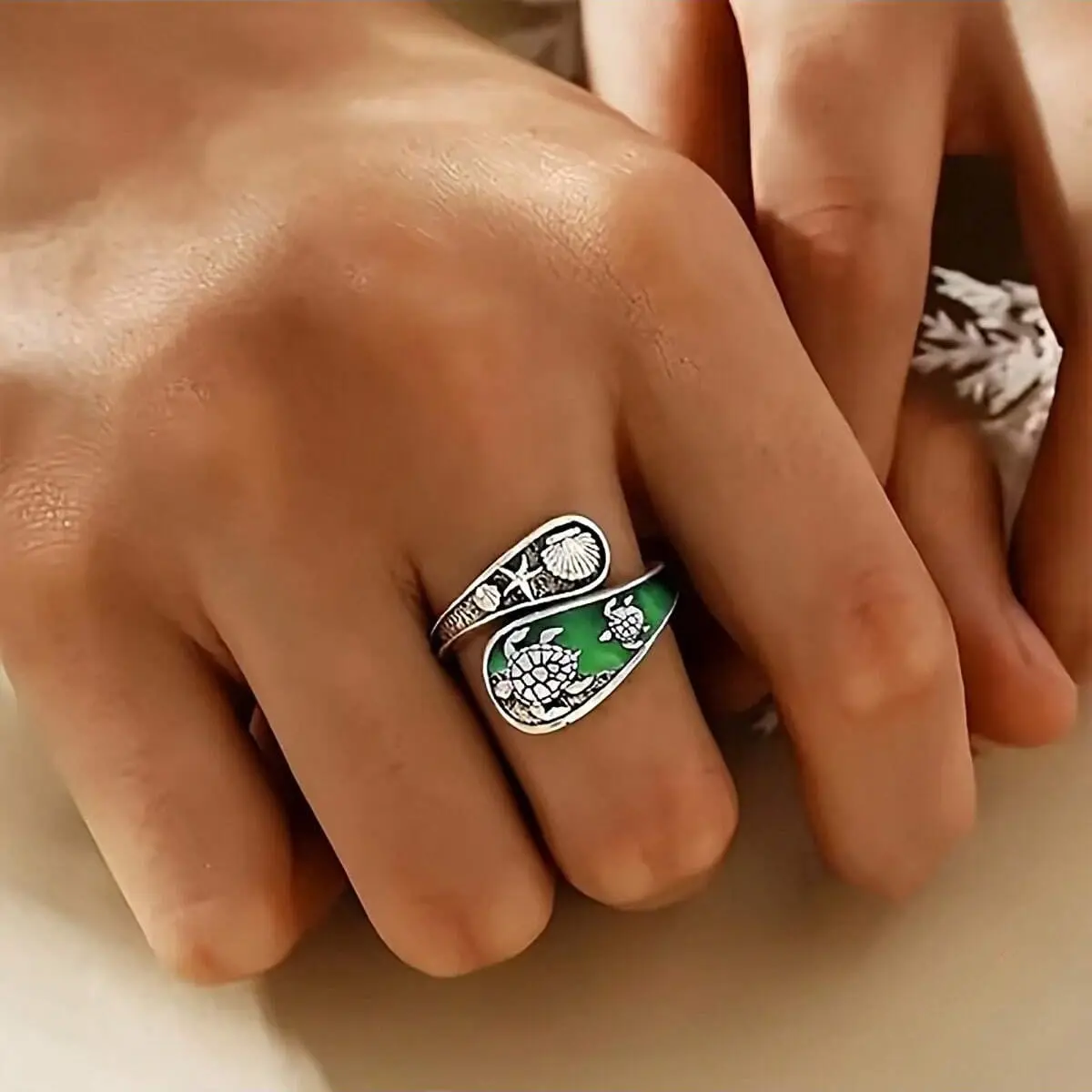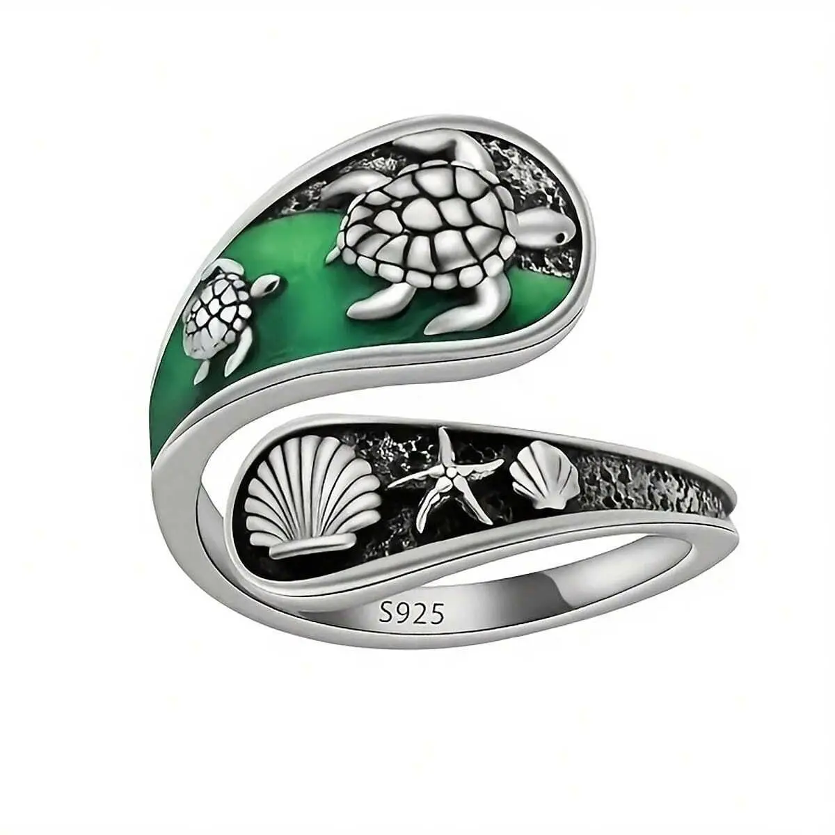 ·Jewelry Details: The ring showcases a green enamel background with silver sea turtle, shell, and starfish. It is ideal for beachwear or as a unique ocean-themed accessory. 🐚