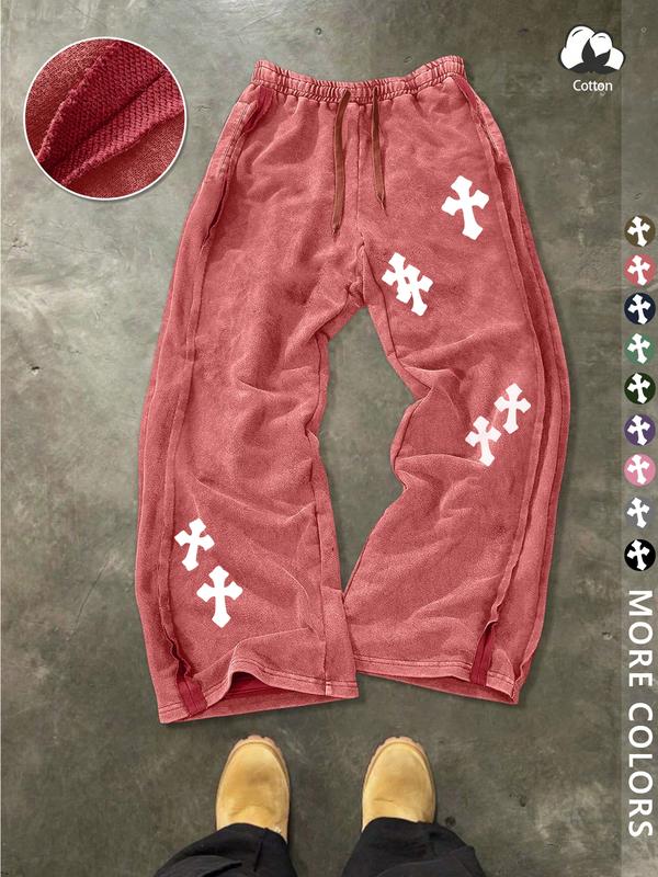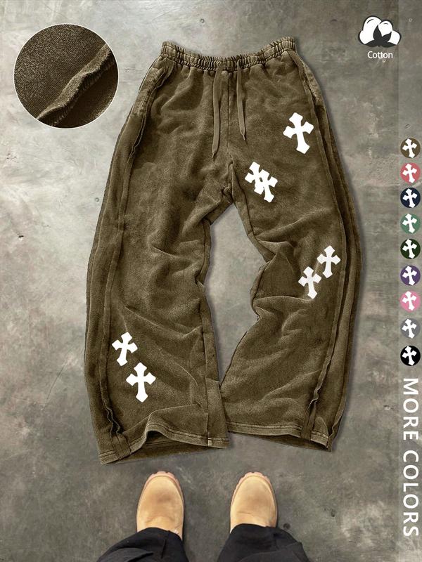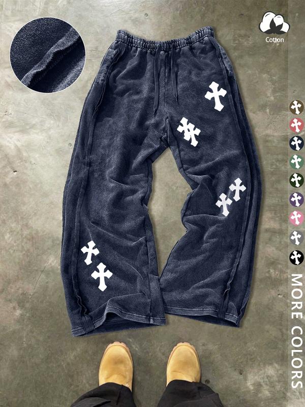 Unisex Street Style Cross Print Cotton Sweatpants, Loose Fit, Elastic Waist, Washed Cotton Fabric, Casual Fashion, Y2K.men's gift
