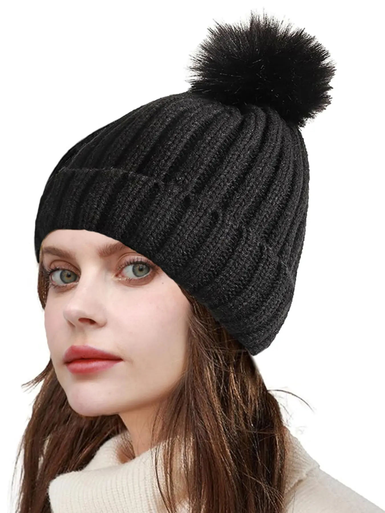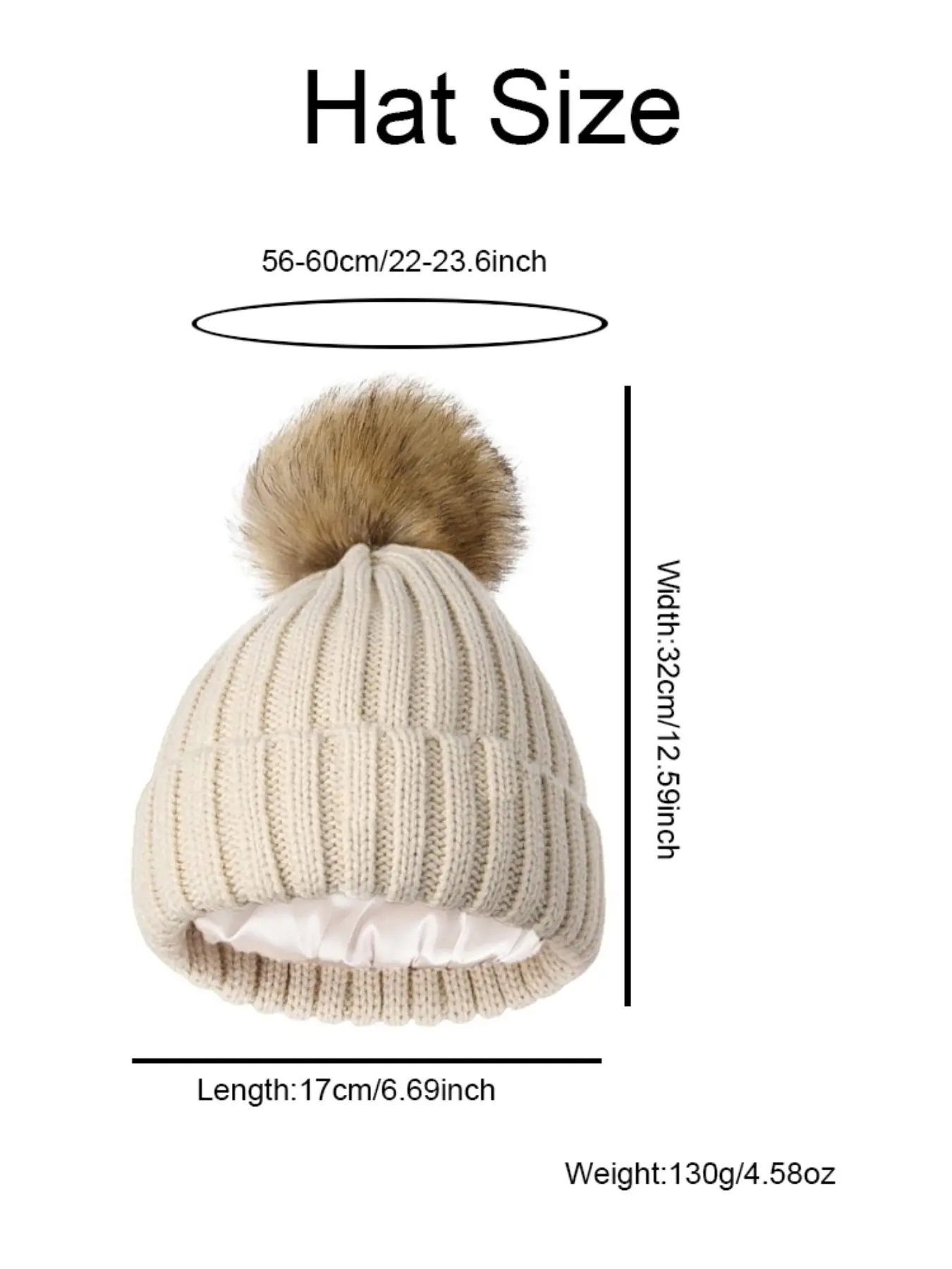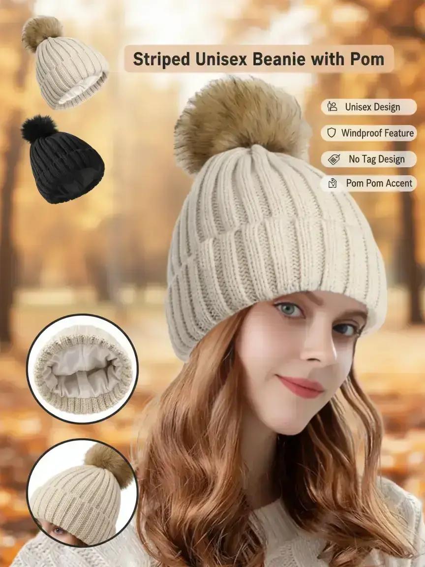 Unisex Plain Striped Beanie Hat, Satin Lined Knit Cap with Pom Pom, Warm Comfortable Windproof Winter Accessory, No Tag Design, Knitted Winter Hat