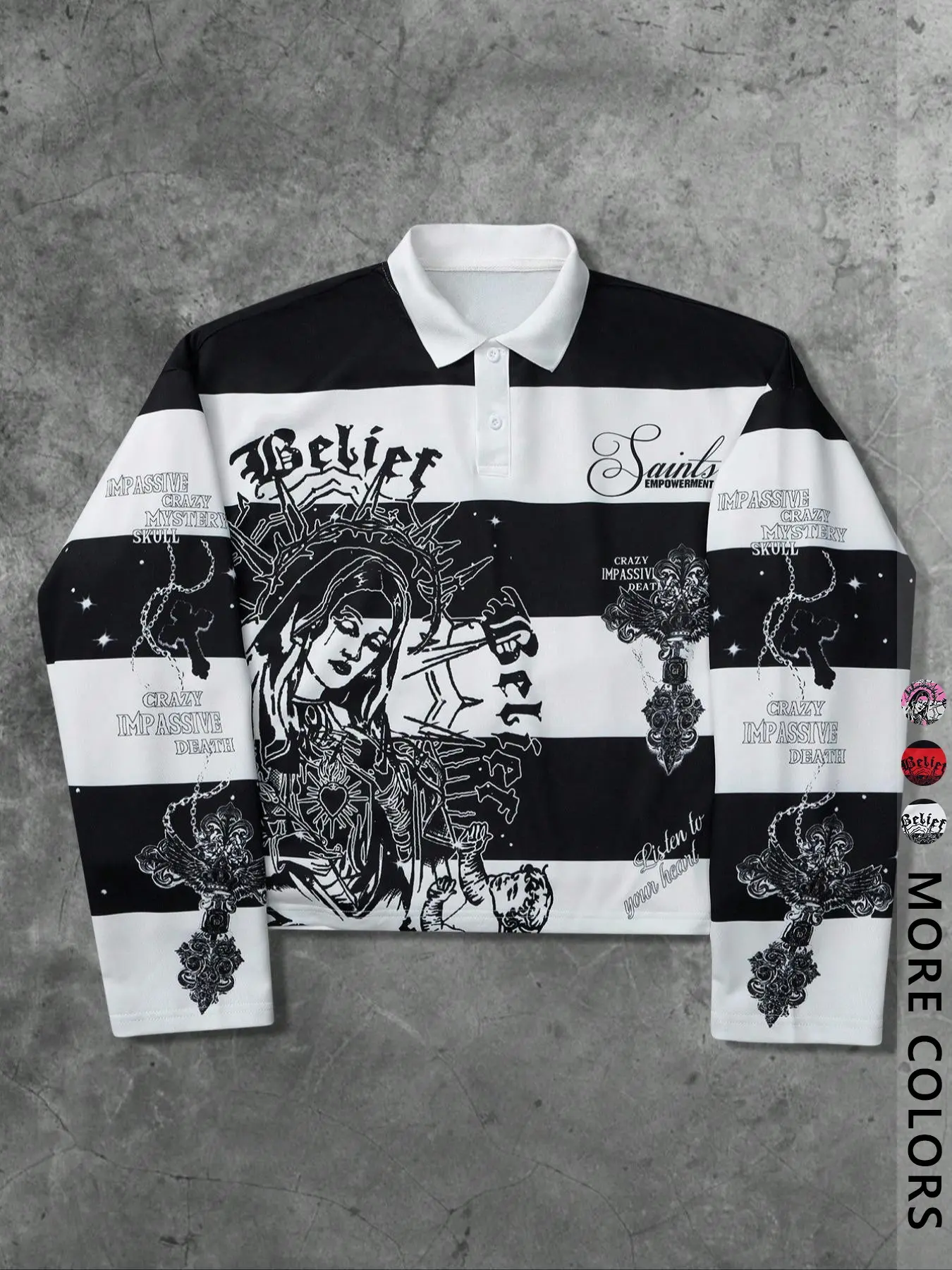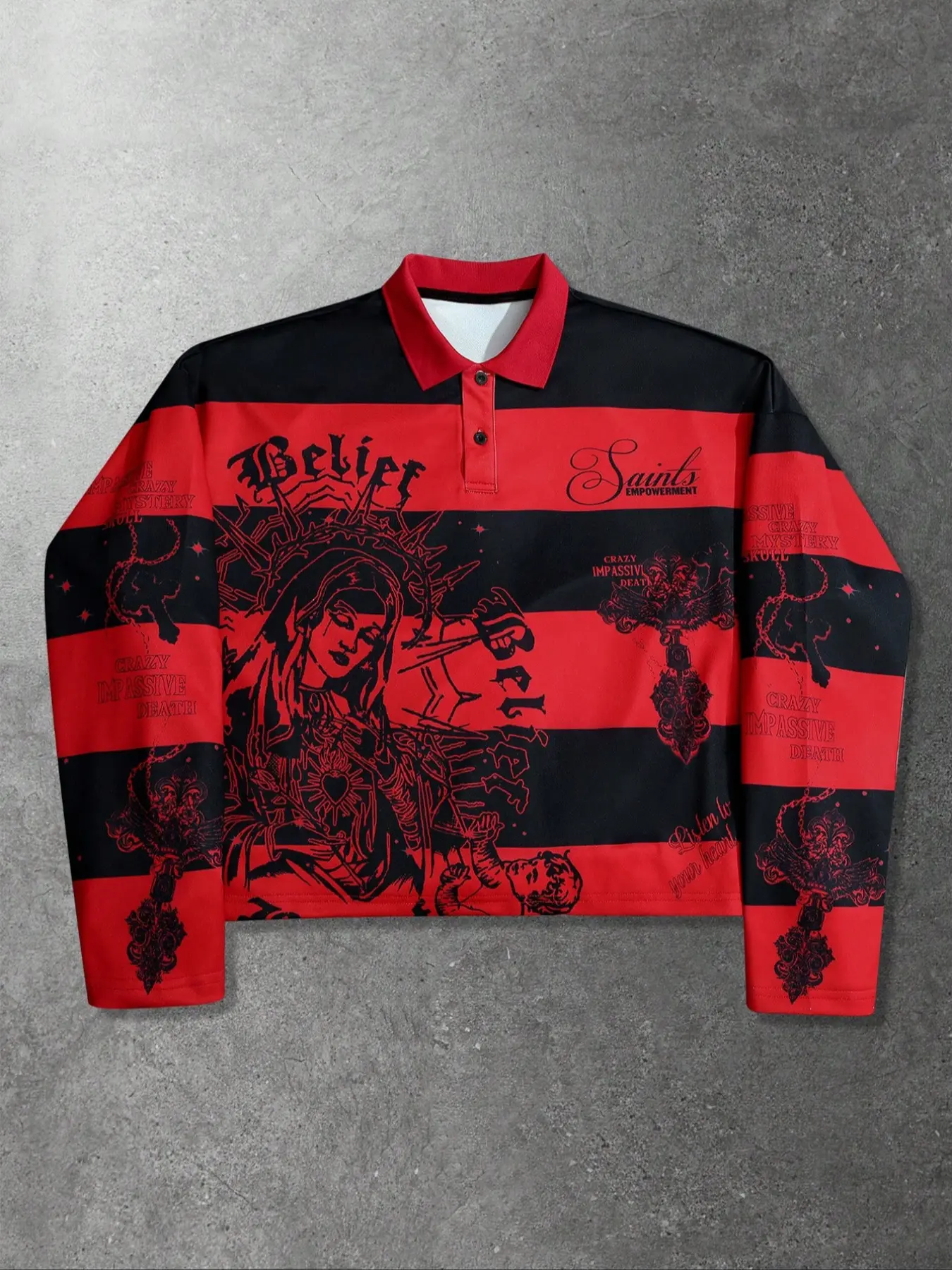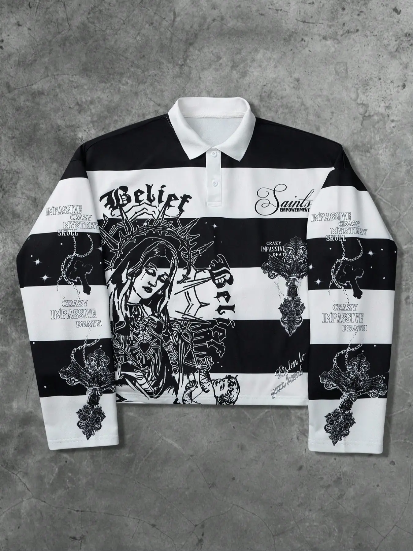 【Unique Print】: Features a striking print of the Virgin Mary and Saints' cross, setting it apart in the streetwear segment.