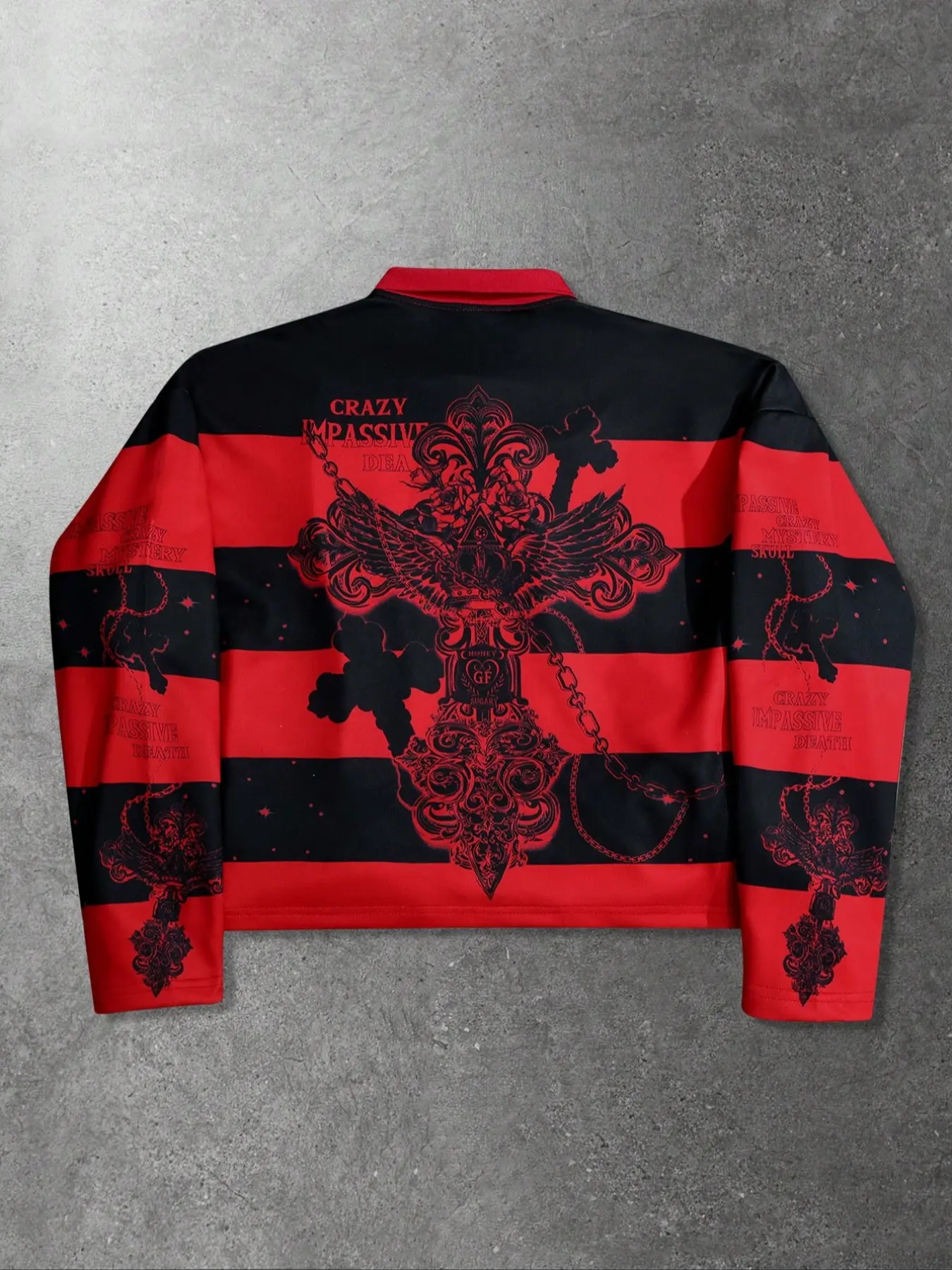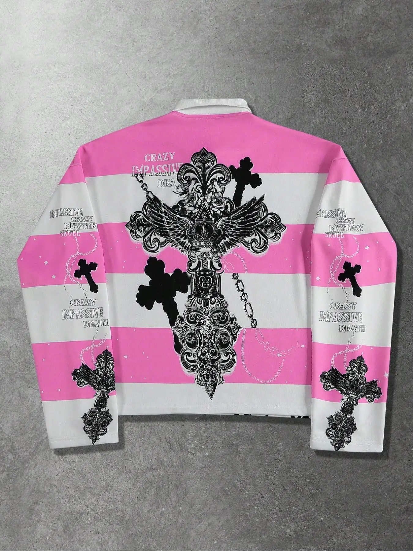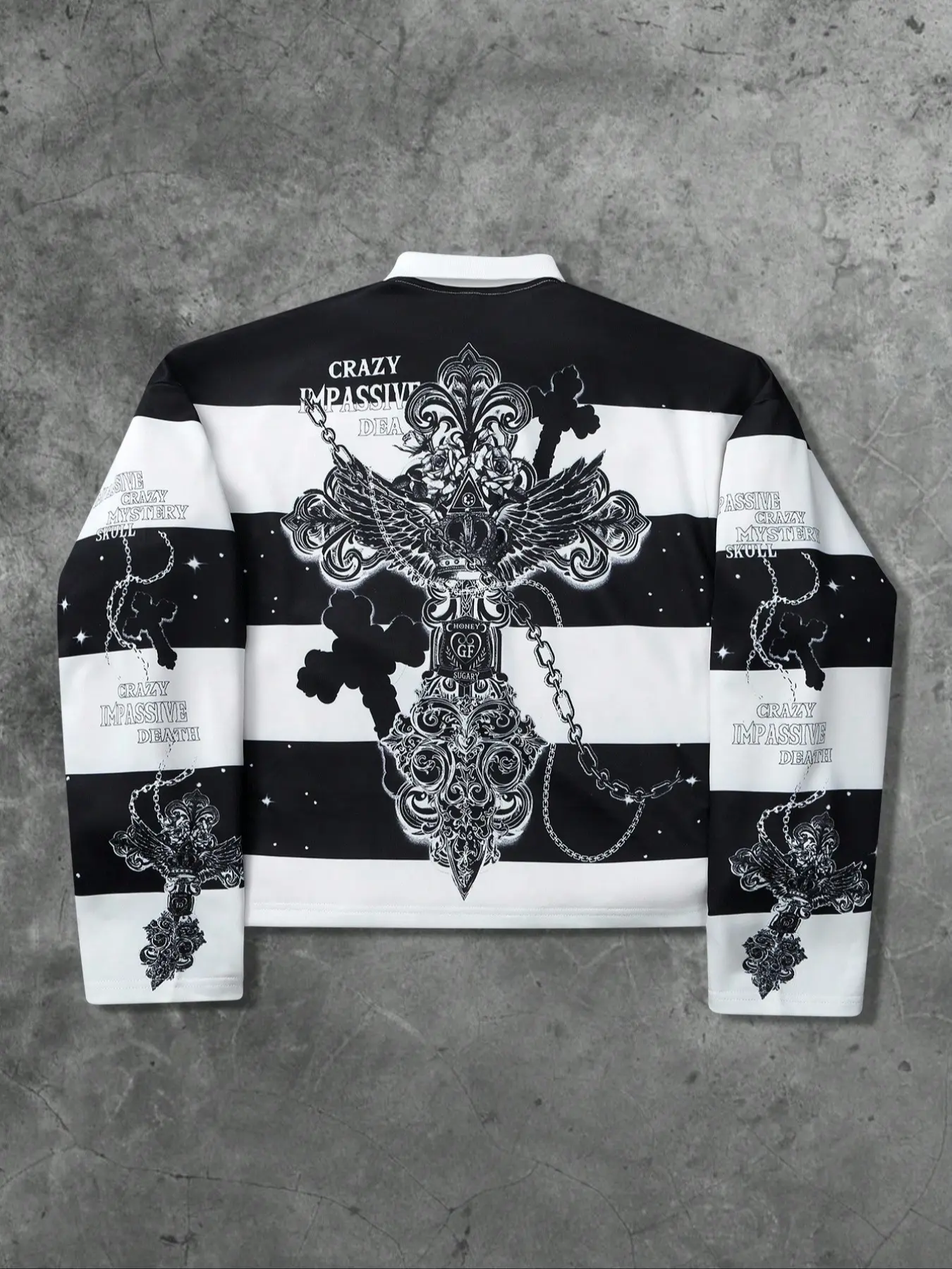 【Unique Print】: Features a striking print of the Virgin Mary and Saints' cross, setting it apart in the streetwear segment.