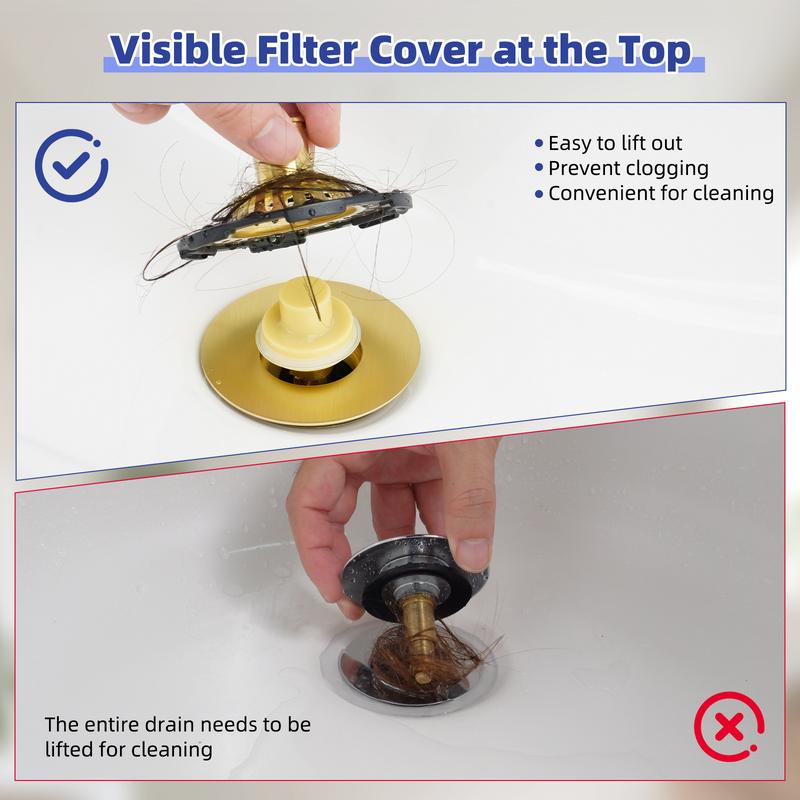 Universal Bathtub Drain Stopper Shower Drain Hair Catcher, Tub Stopper with Visible Top Strainer, Upgraded 3 in 1 Pop-up Drain Plug Fit for 1.5 to 2.4" Hole, Stainless Filter Basket, Brushed Gold