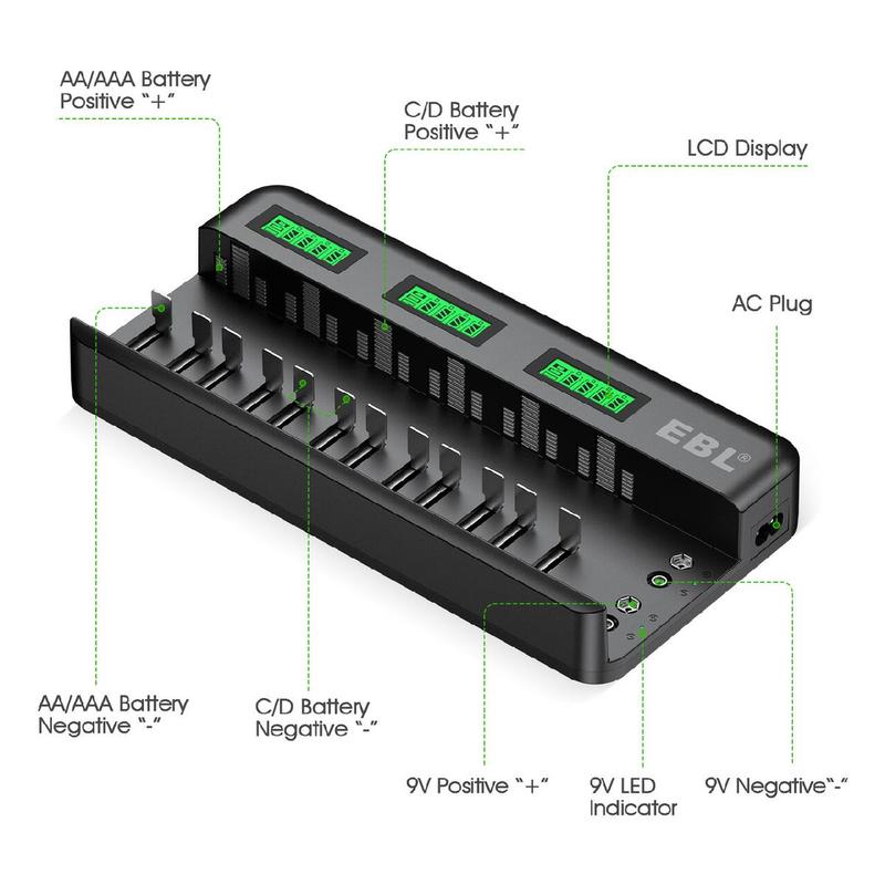·Up to 14 Different charging slots, allow you to charge 1-12PCS AA AAA or 1-6PCS C D Ni-MH/Ni-CD rechargeable batteries and 1-2 PCS 9V Li-ion/Ni-MH/Ni-CD rechargeable batteries, ultra-fit for any brand batteries.