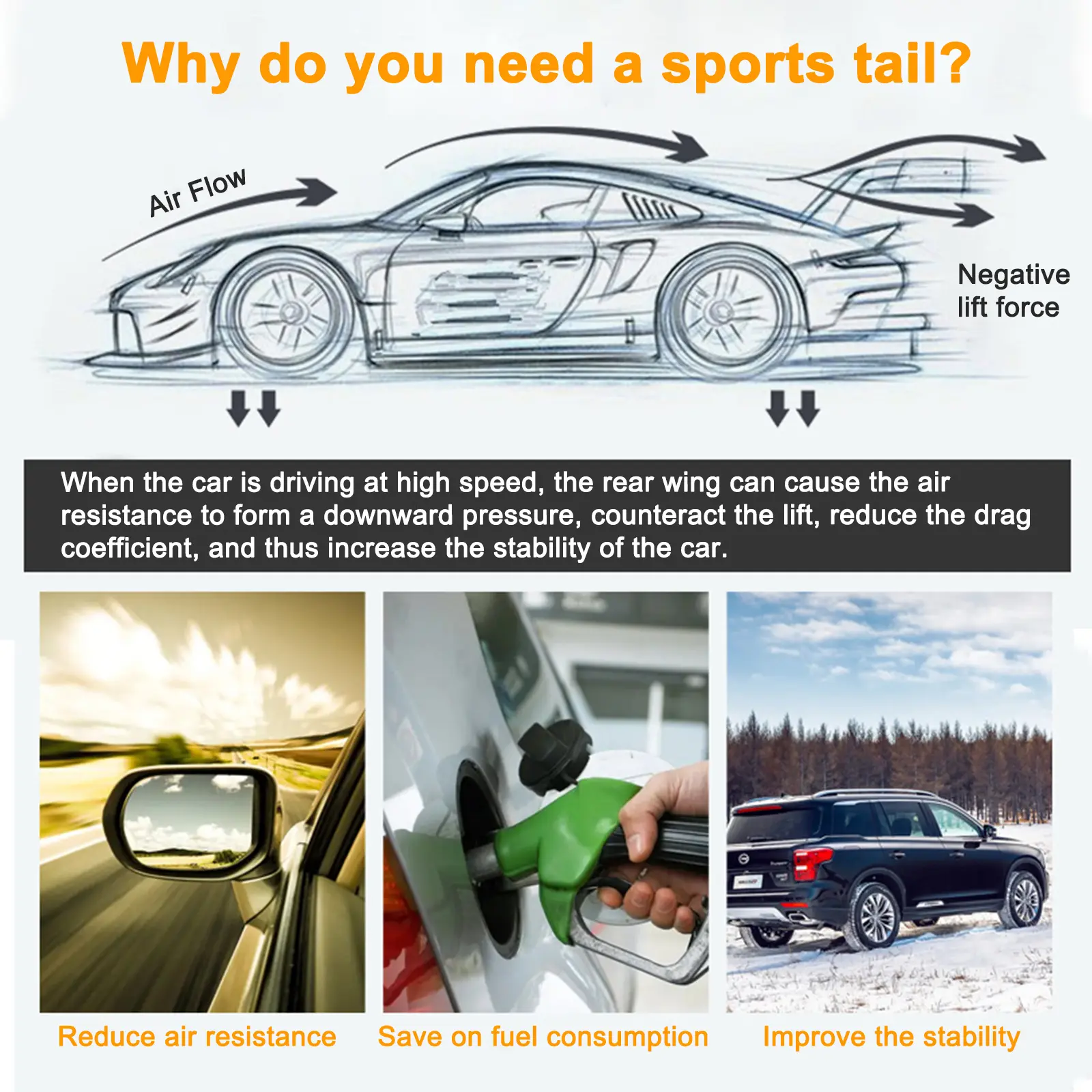 According to the aerodynamic,it also acts as a function of reducing air resistance, increases the stability of the vehicle.