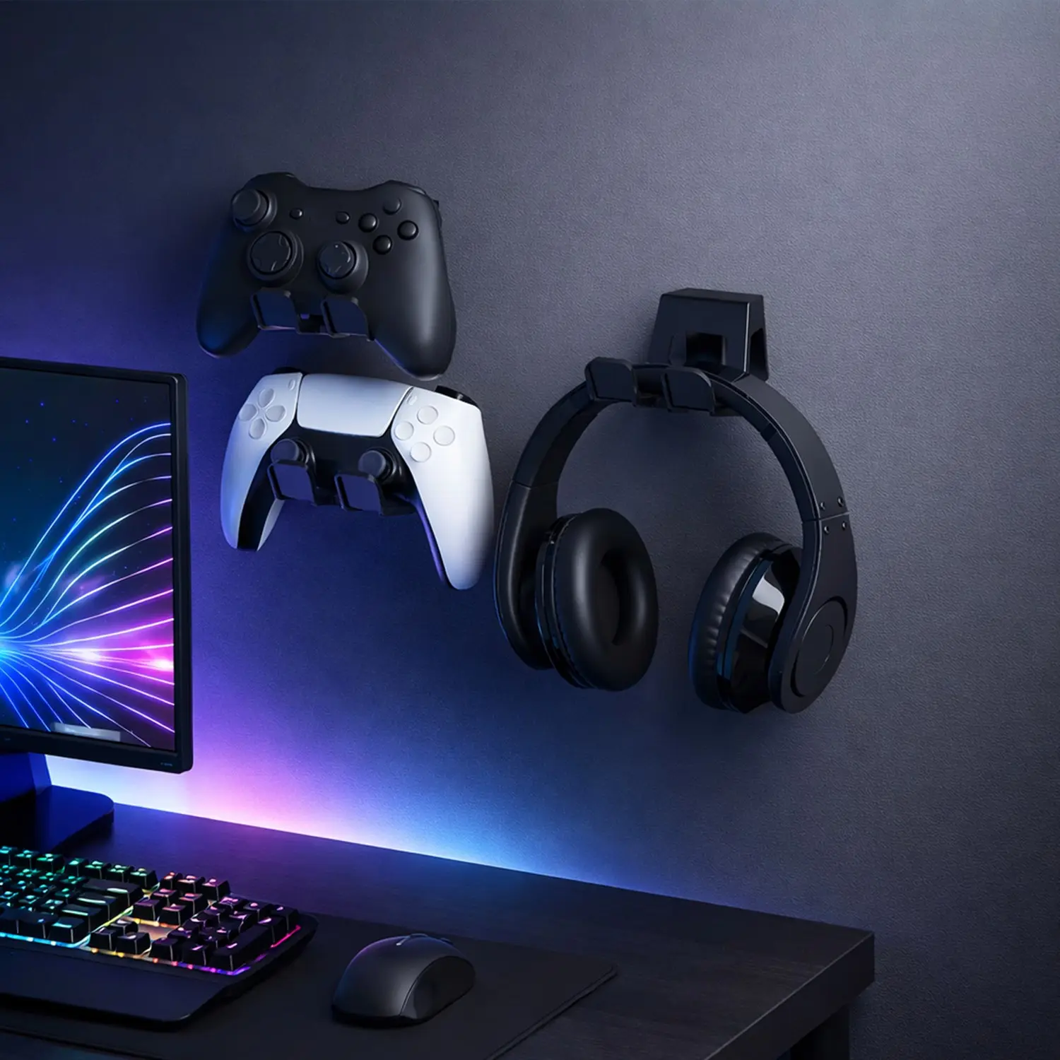 RGB Game Controller Holder and Headphone Stand, Headset Holder, Multi Color LED Gaming Desk Organizer, Universal Display Stand Compatible with PS5, Xbox and Switch Controllers, Space Saving Gaming Accessories for Desktop Setup