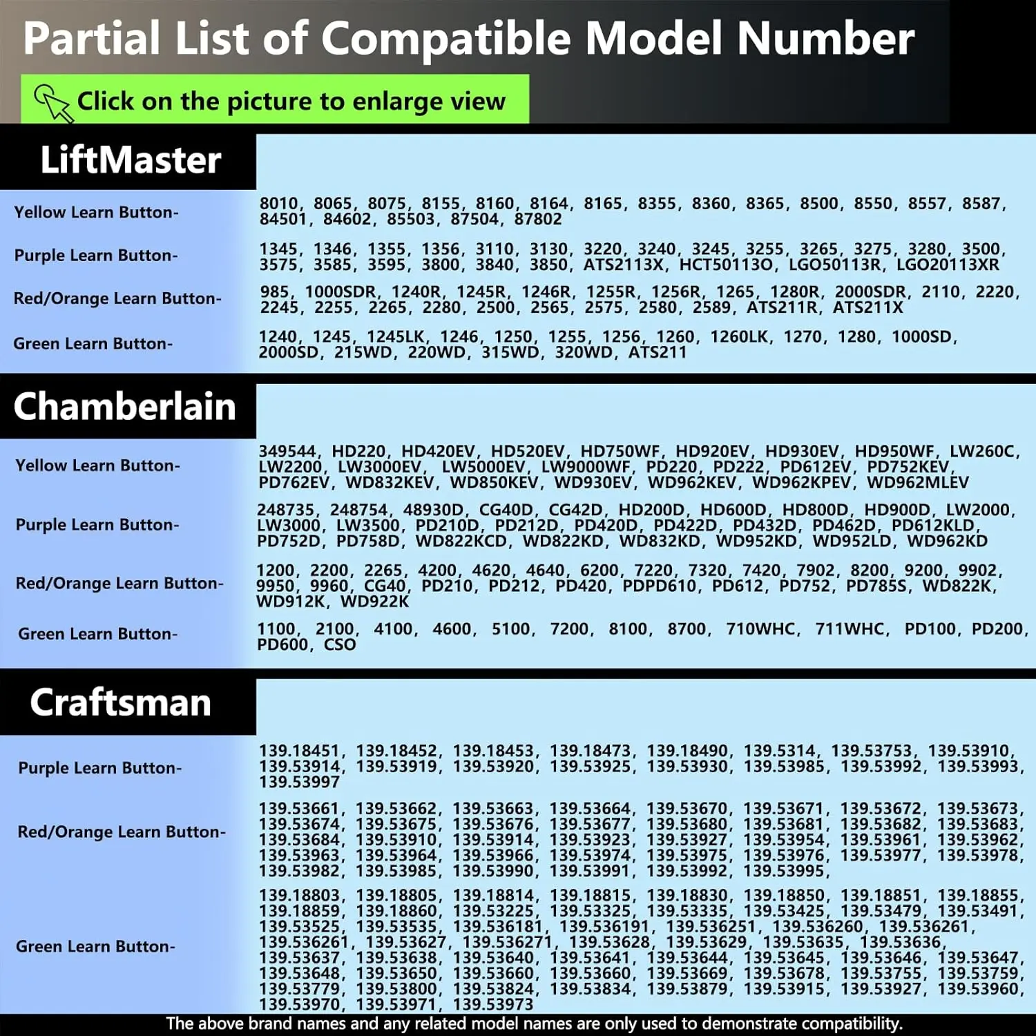Universal Garage Door Remote - The universal garage door opener remote compatible with Liftmaste Chamerlain Sears Craftsman Opener made from 1993-Current has Purple/ Yellow/ Red/ Orange/ Green color Learn Button. (For more compatibility please refer to the compatibility list in the 3rd and 4th main picture ). CAN'T support Dip ones.