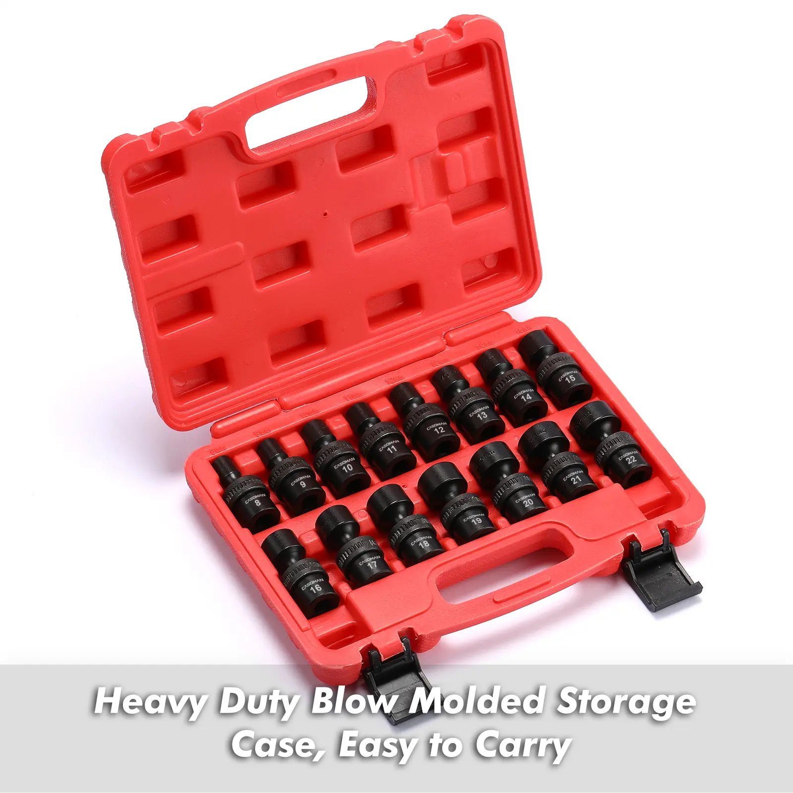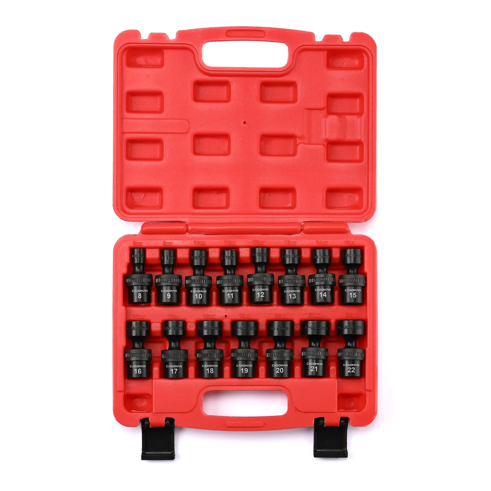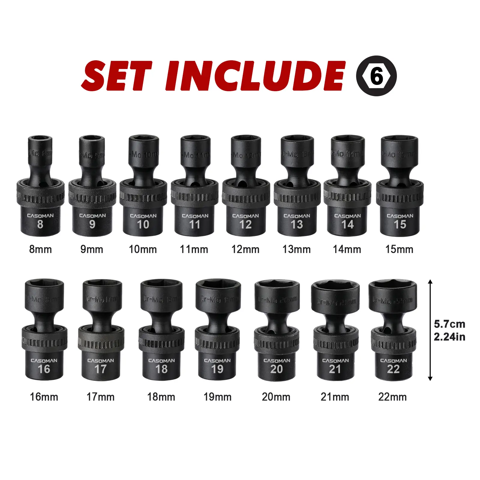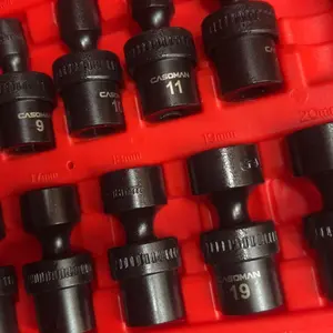This CASOMAN 15 Piece 3/8" Drive Shallow Universal Impact Socket Set, which is made from premium impact grade chrome molybdenum steel construction with corrosion-resistant black phosphate finish for durability. The flex socket design allows a full 360° of freedom for the universal head to angle and rotate. It is high-contrast size marking is permanently laser and easy to read, even in low light.