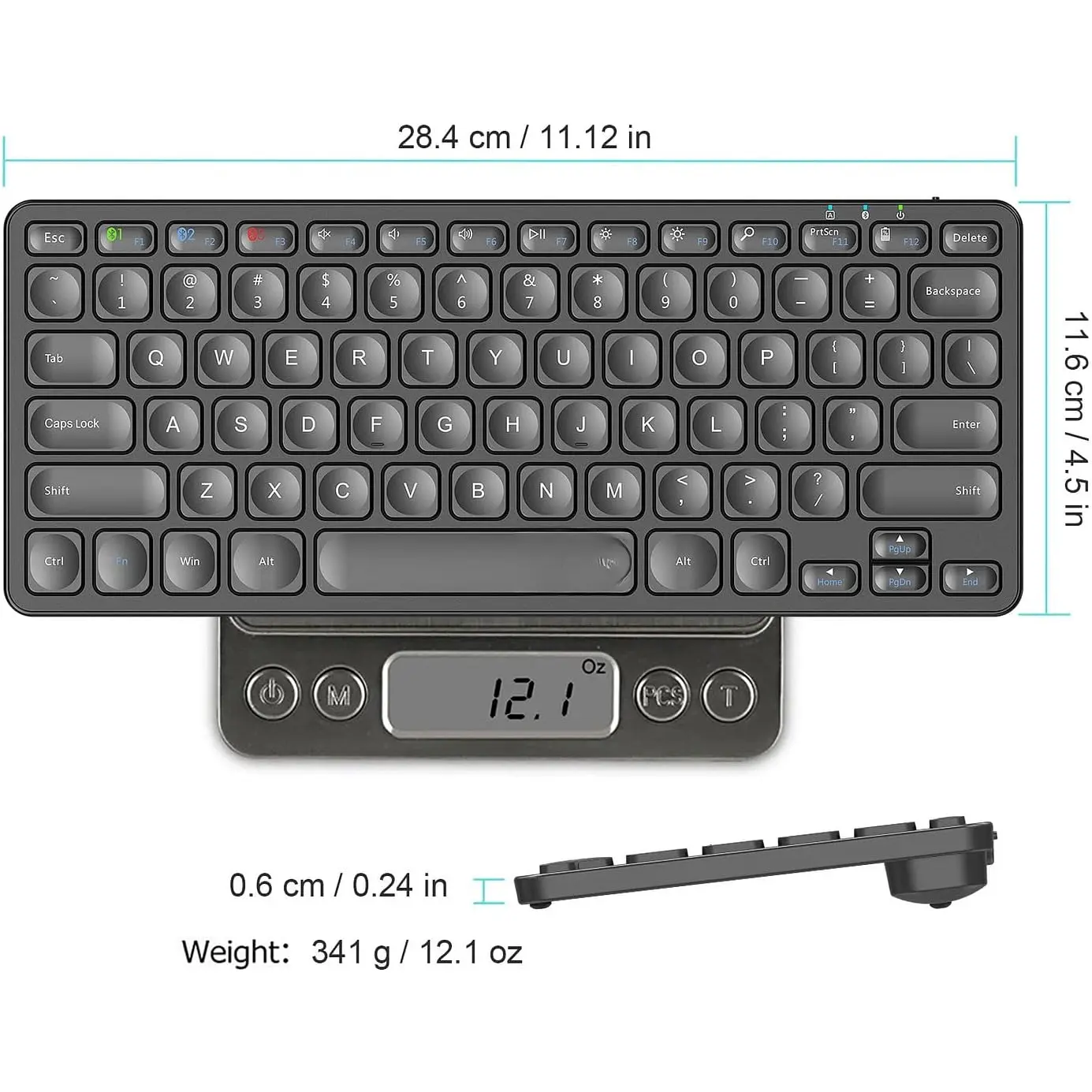 Ultra Compact, Thin and Light: Compact size (11.12 X 4.5 X 0.24in) and light weight (12.1oz) but provides full size , shortcuts for comfortable typing.