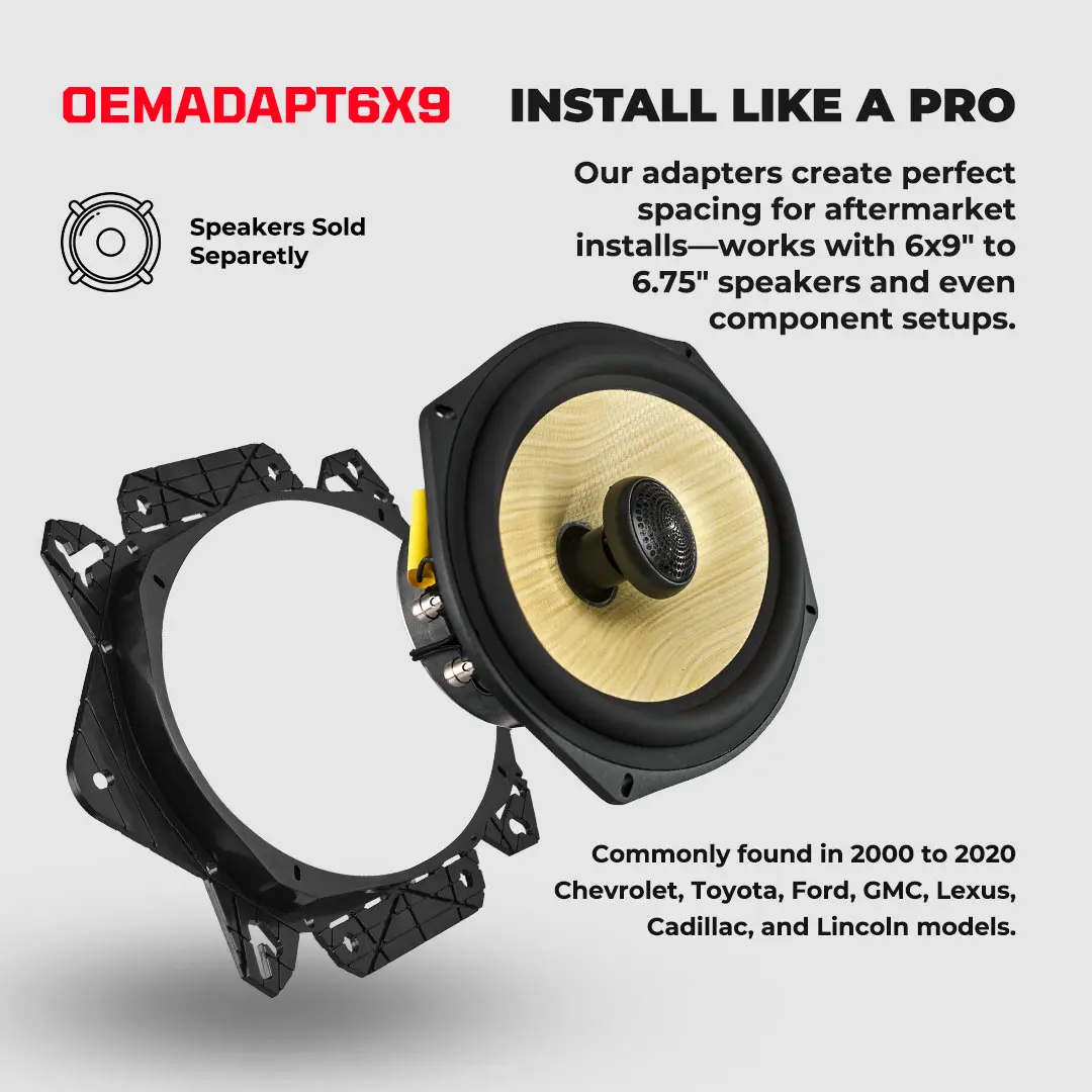 This universal adapter fits your aftermarket 6 x 9” speakers into those 6.75” mounting spaces. (commonly found in 2000 to 2020 Chevrolet, Toyota, Ford, GMC, Lexus, Cadillac, and Lincoln models.)