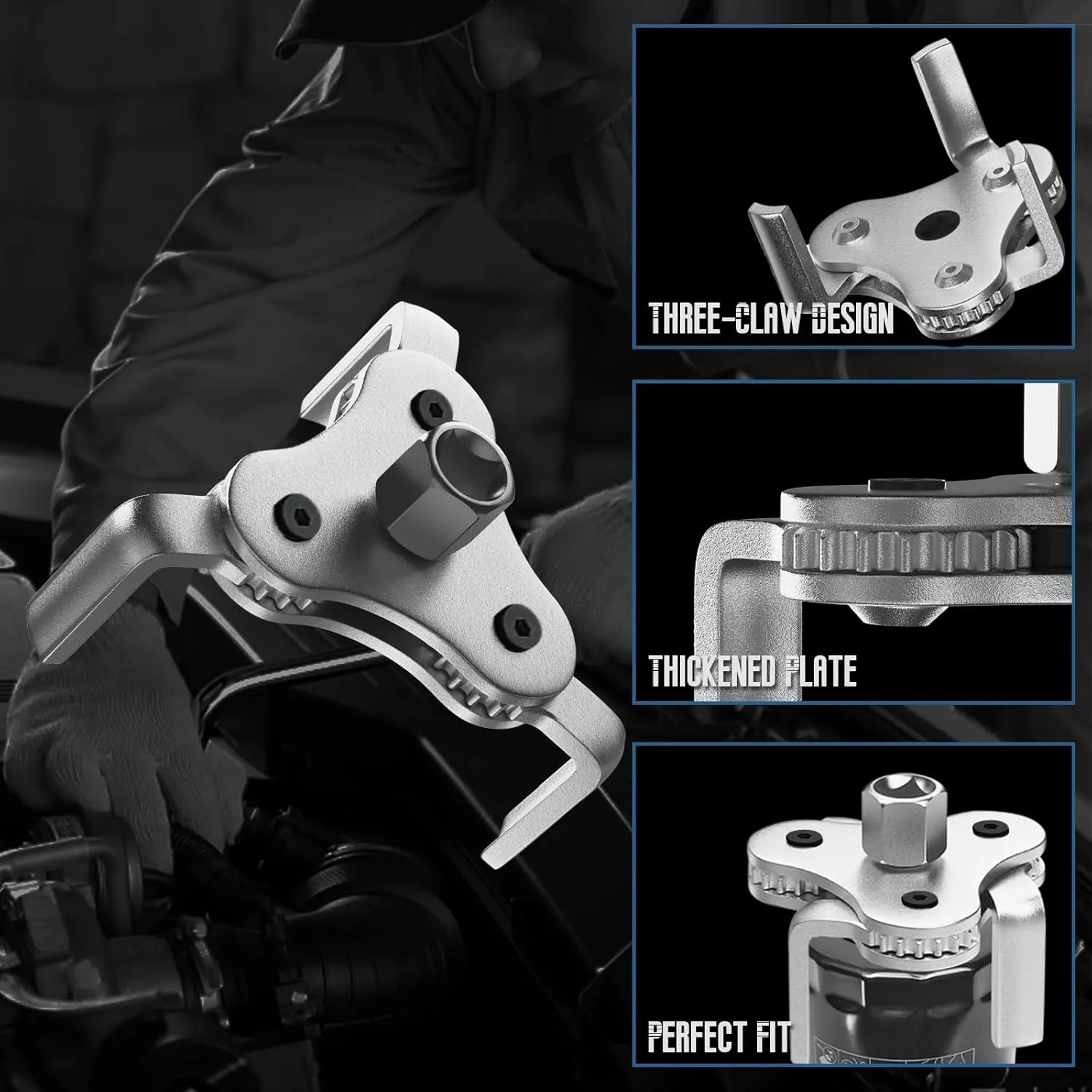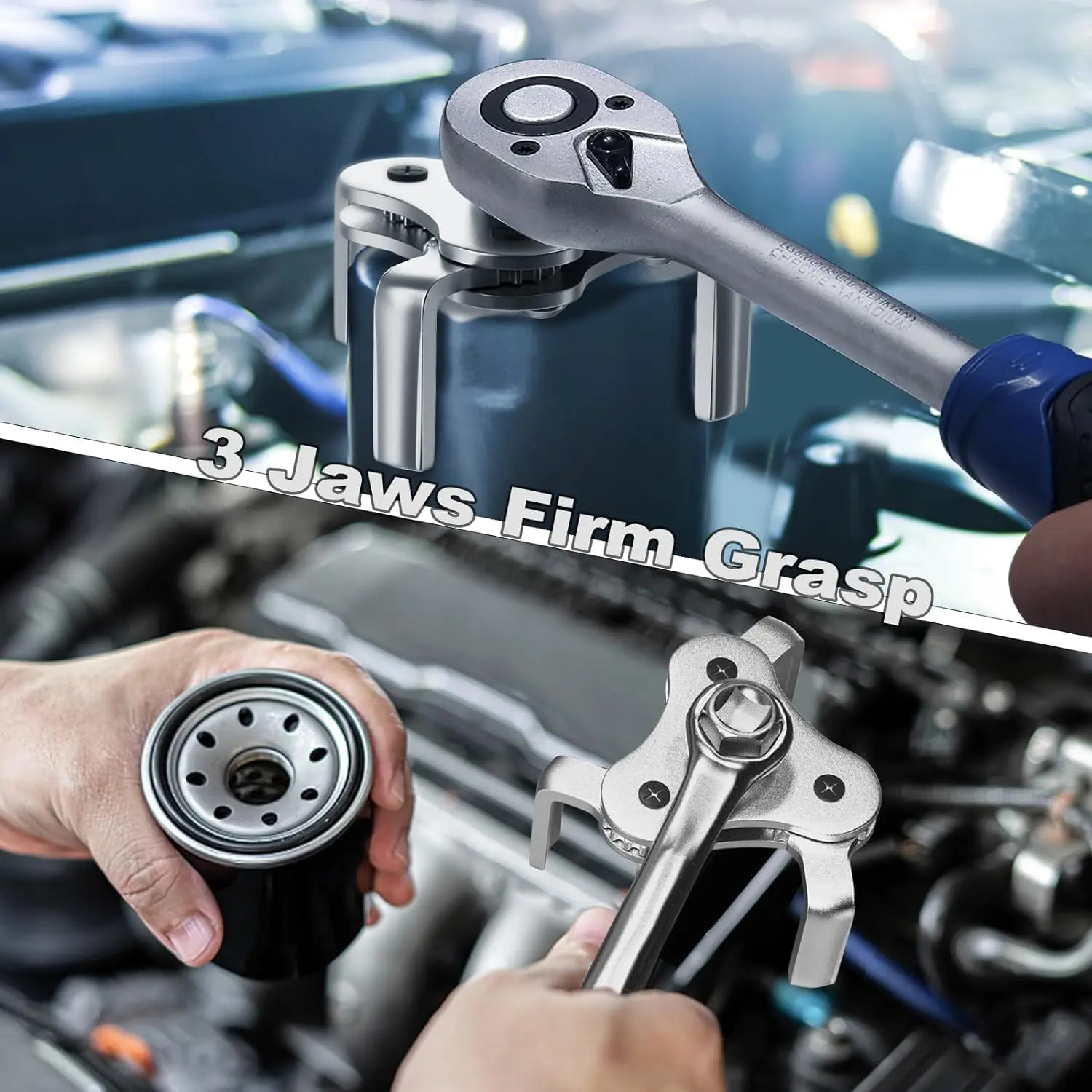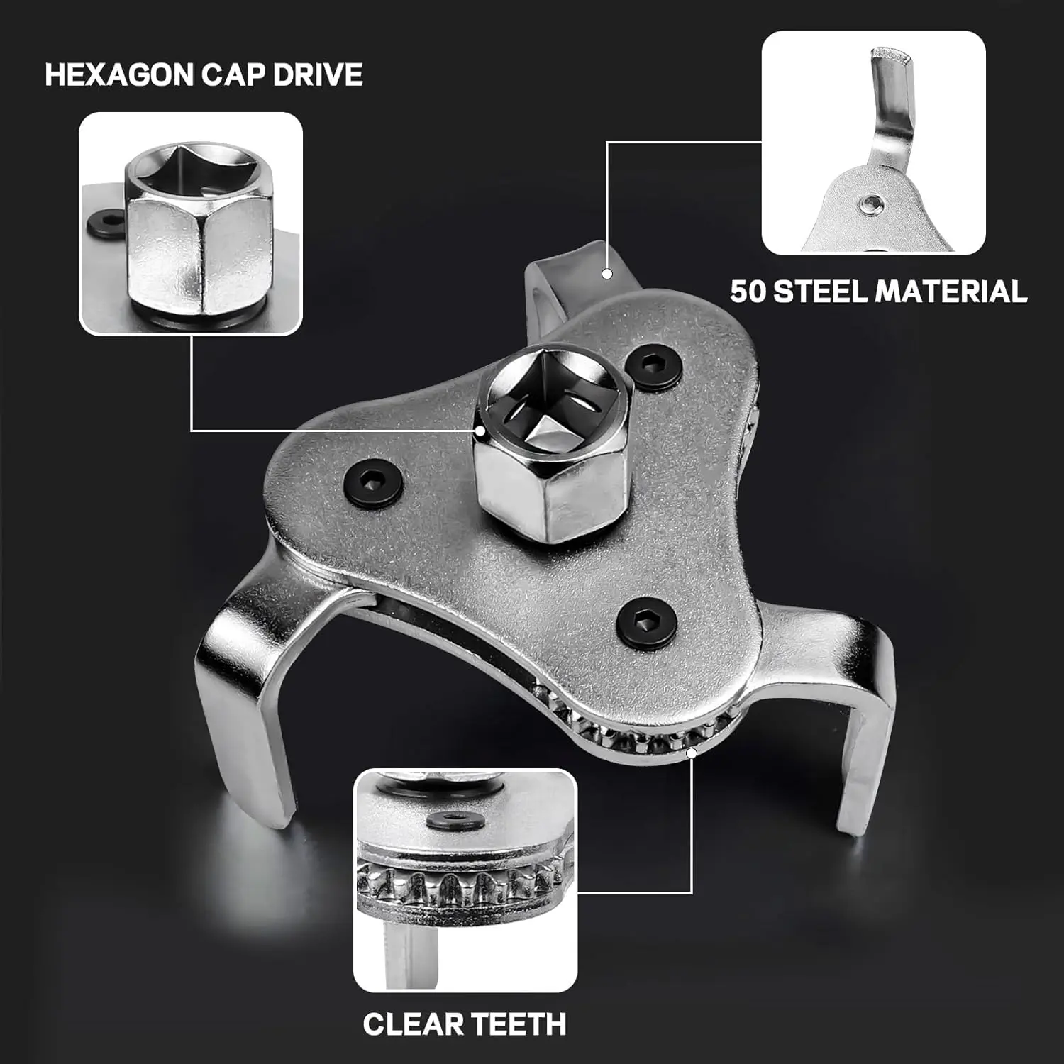 ·【Compatible Tools】: The 3-jaw oil filter wrench features a drive adapter that allows it to be used with a 1/2-inch or 3/8-inch square drive ratchet or a 7/8-inch hex wrench. Please note that the ratchet and hex wrench are not included in the package.