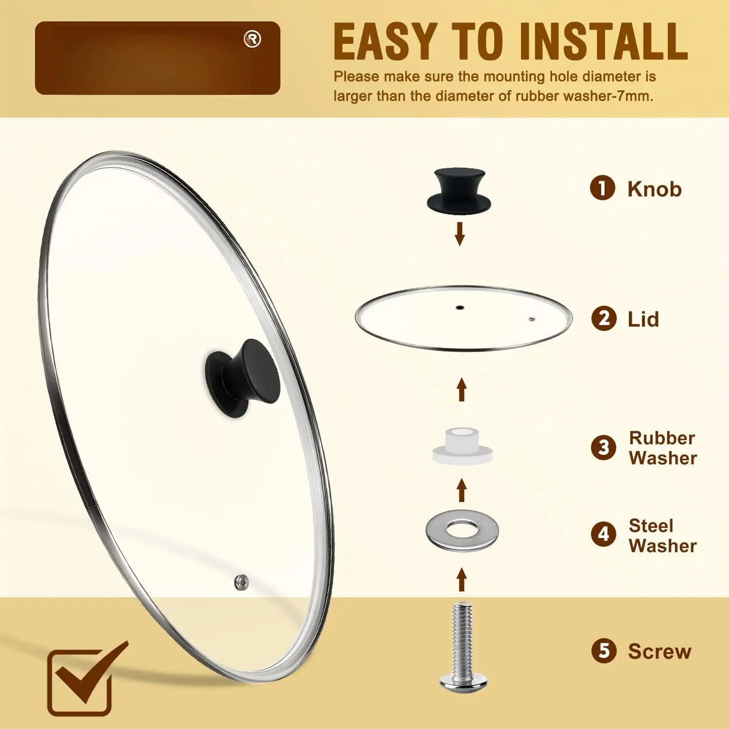 Easy To Install & Clean: 2 sets of pot lid knobs in total: 2 x knobs, 2 x screws, 2 x rubber washers, 2 x stainless steel washers. You can assemble the knob within one minute by yourself. Just attach the knob, rubber washer and steel washer to the pot lid, then tighten the screw on them. Easy to clean by rinsing the knob under running water. Dishwasher safe.