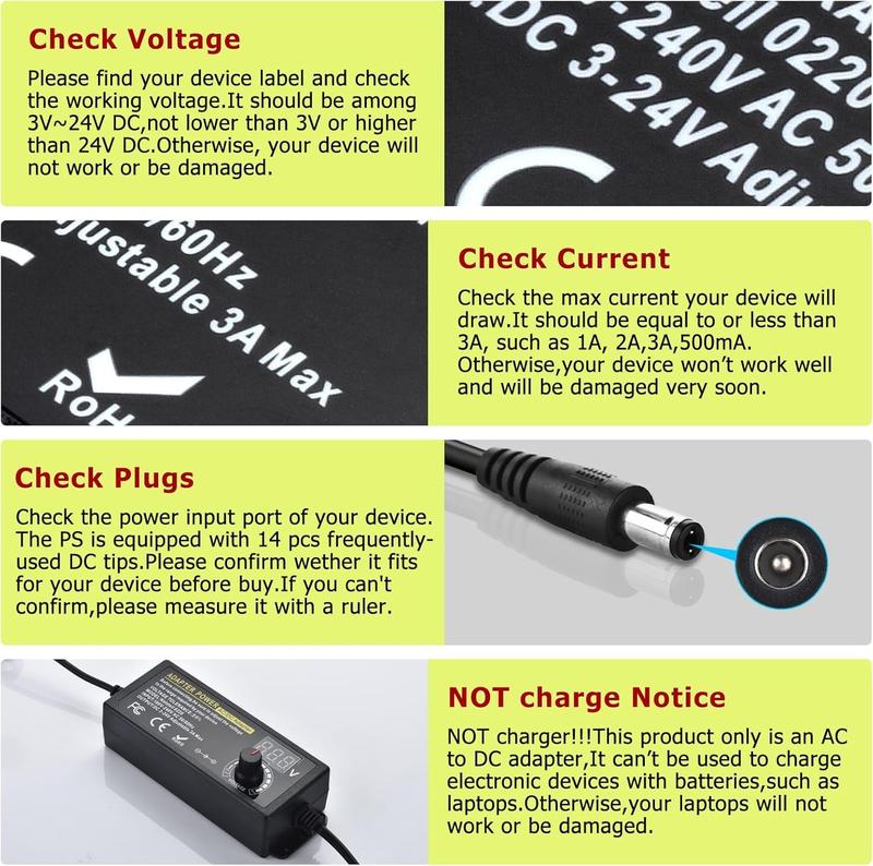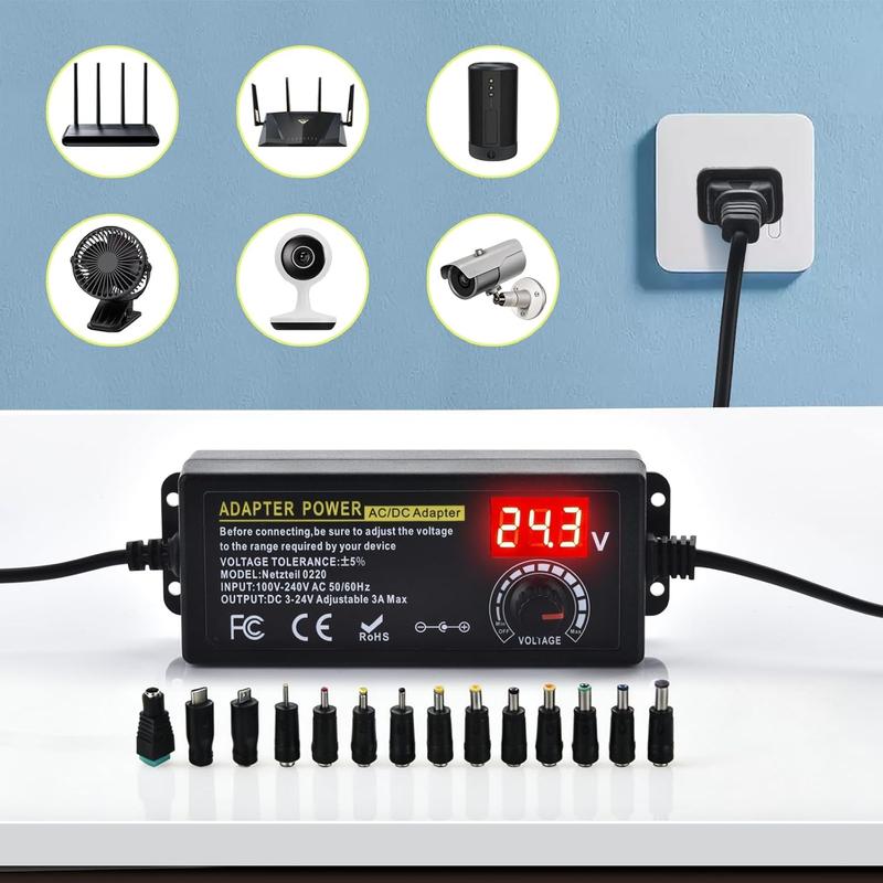 This Universal Power Supply converts AC to DC, adjustable from 3.5 to 24V at 2A. It features an LCD screen and digital display. The US power plug is included. Reverse polarity wiring and 14 connectors are provided. Input: AC 100V~240V 50/60Hz. Output voltage: DC 3V~24V adjustable. Output current/wattage: 3A, 72W max.