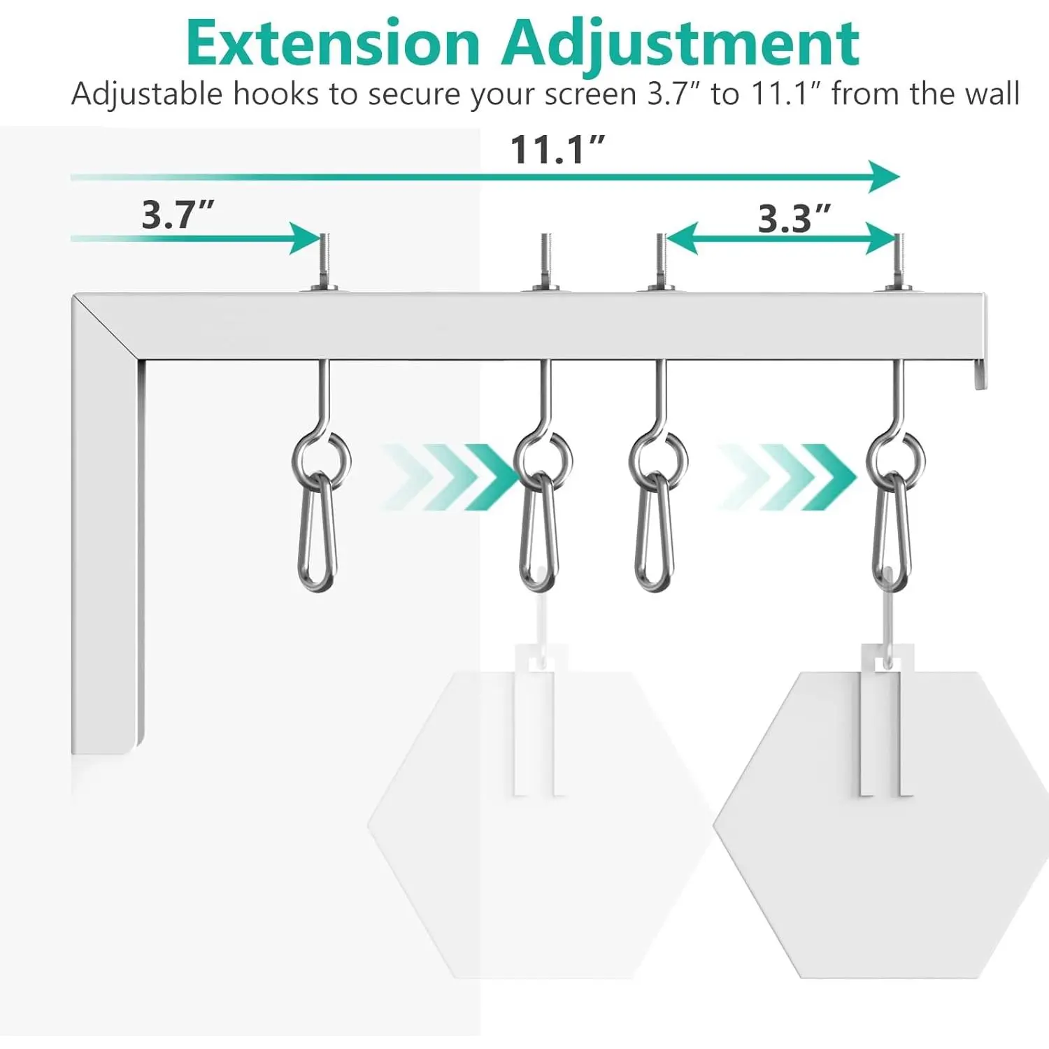 Adjustment: Adjustable hooks to securely hold your screen up to 12” from the wall. Allowing for corner, chalkboard or television clearance and eliminating keystone effect.