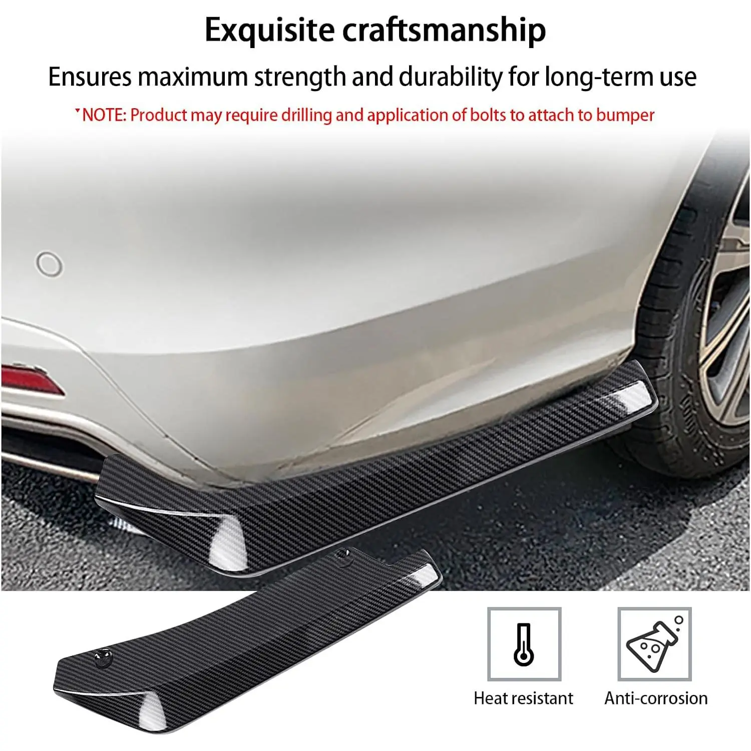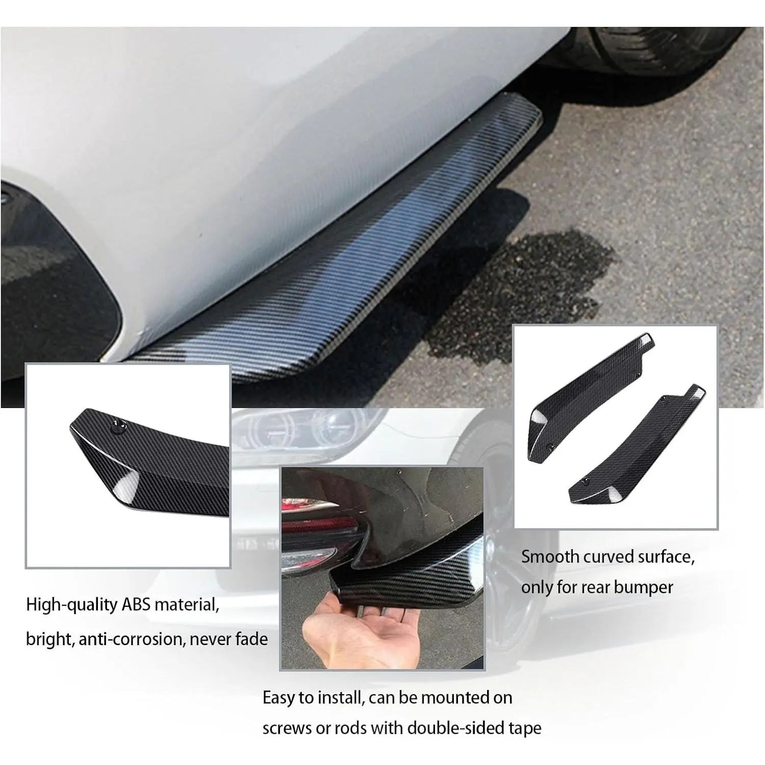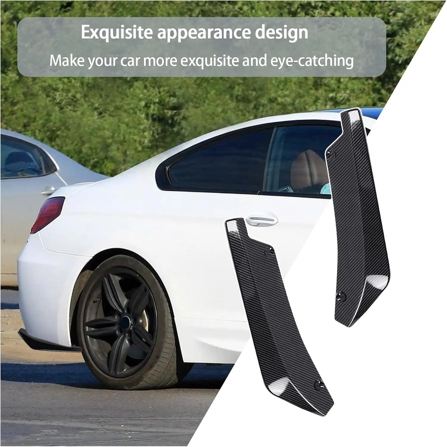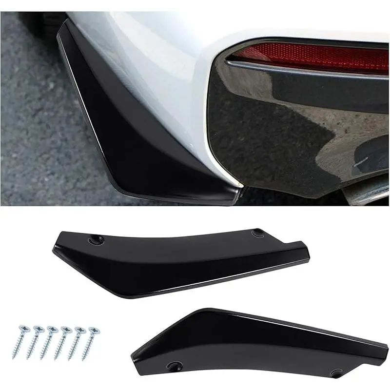 [Great Material]: This product is durable and has a long lifespan. It is made of PP material, and it's anti-corrosion, anti-rust and waterproof. It can withstand the rigors of daily driving. Despite challenging road conditions, it will remain secure and provide continuous protection and style enhancement. [Stabilize Drive]: This spoiler helps to counteract some of the aerodynamic lift as you drive, effectively enhancing the overall ground traction at the wheels. It leads to a substantial improvement in the dynamics and handles stability of your vehicle, particularly at higher speeds, ensuring a safer and more controlled driving experience. [Crash Proof]: The anti-scratch car side fender skirt canard protector is a perfect all-round protection for your rear bumper. It effectively acts as a protective barrier, helping to prevent body-to-body collisions, which can often occur in tight parking spaces or congested traffic situations. [Perfect Decoration]: It fits most models, has a minimalist and atmospheric design, and can only be mounted in the rear bumper position. It not only has a practical function, but also has a cool appearance, so it is a perfect car decoration. The distinctive design, which features a stereoscopic shape and a fluid curve surface, will draw attention wherever you go. [Easy to Install]: Clean the mounting location, then fix it either on screws or with double sided tape. If your car doesn't have the right holes it will need to be manually drilled and linked to the bumper using bolts. They can be mounted very securely in the rear bumper location and will not easily come loose.