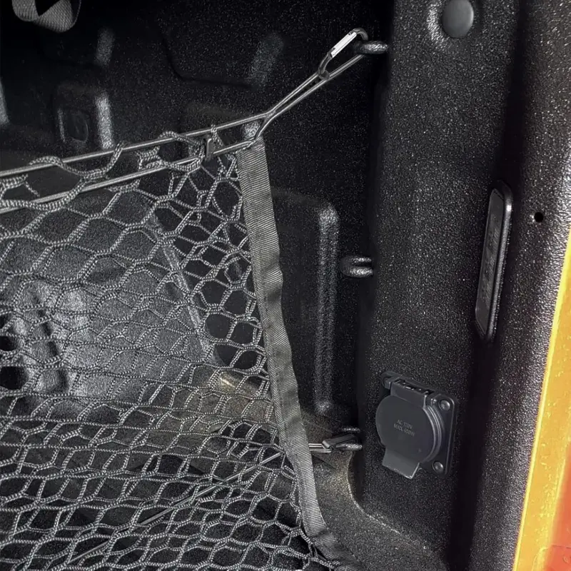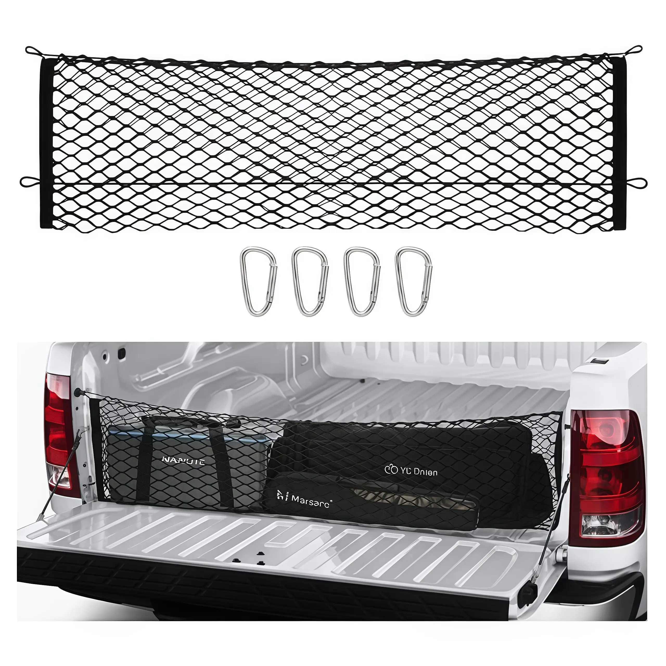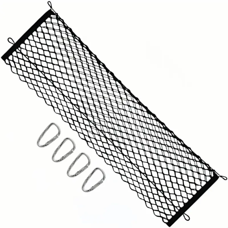 The storage net comes with 4 self-locking metal carabiners. Attach it to the rear cargo area mounting points. The hooks make it easy to take on and off. It folds flat for storage when not in use, making it a convenient truck bed accessory. 🚚