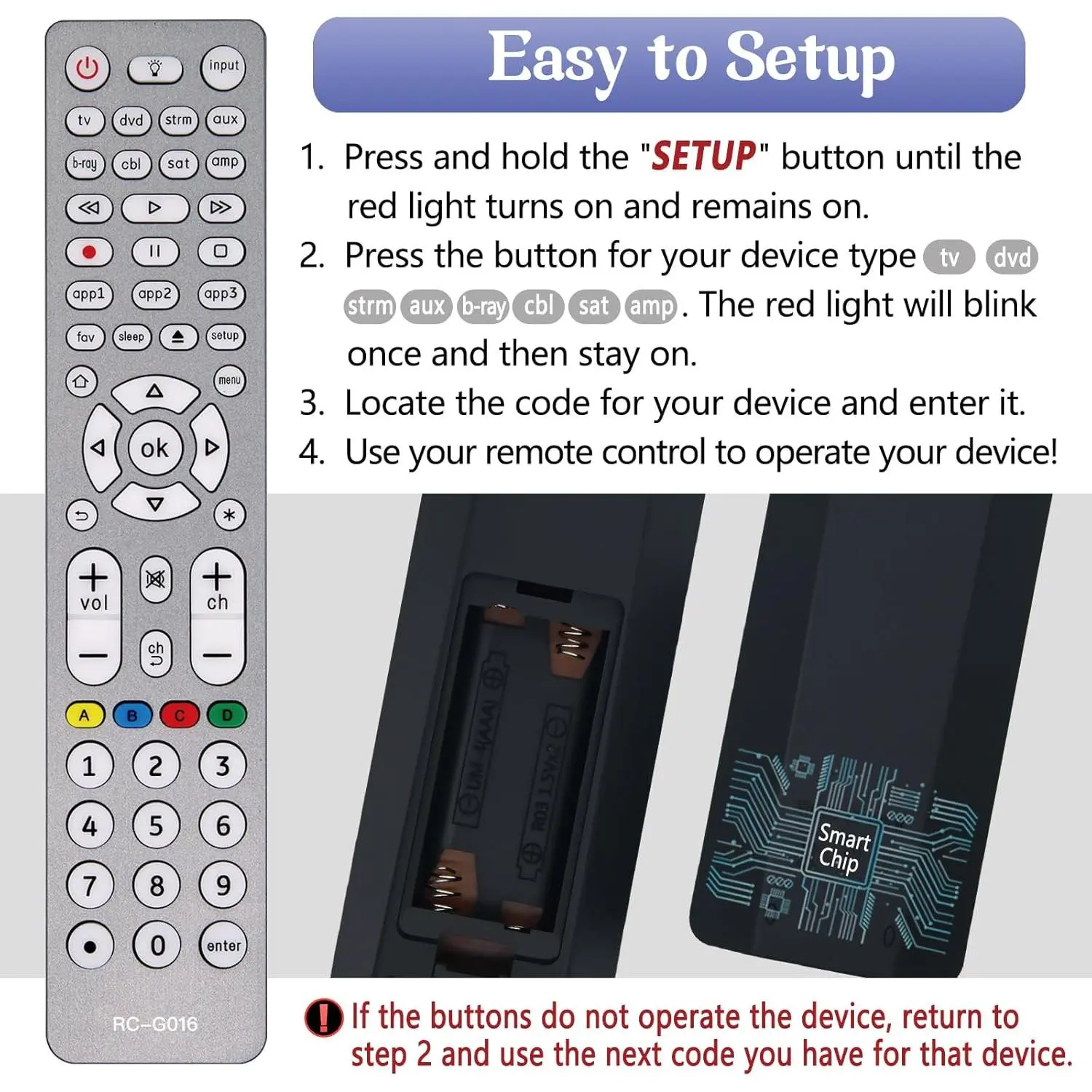 [Easy to Use]This universal remote provides a seamless setup process: ①Press and hold the SETUP button until the red light turns on.②Press and release the desired device button (tv/dvd/strm/aux/b-ray/cbl/sot/amp).③Enter the first 4-digit code for your device.If the buttons do not function as expected, repeat steps 2-3 using the next code from the list until all buttons work properly.