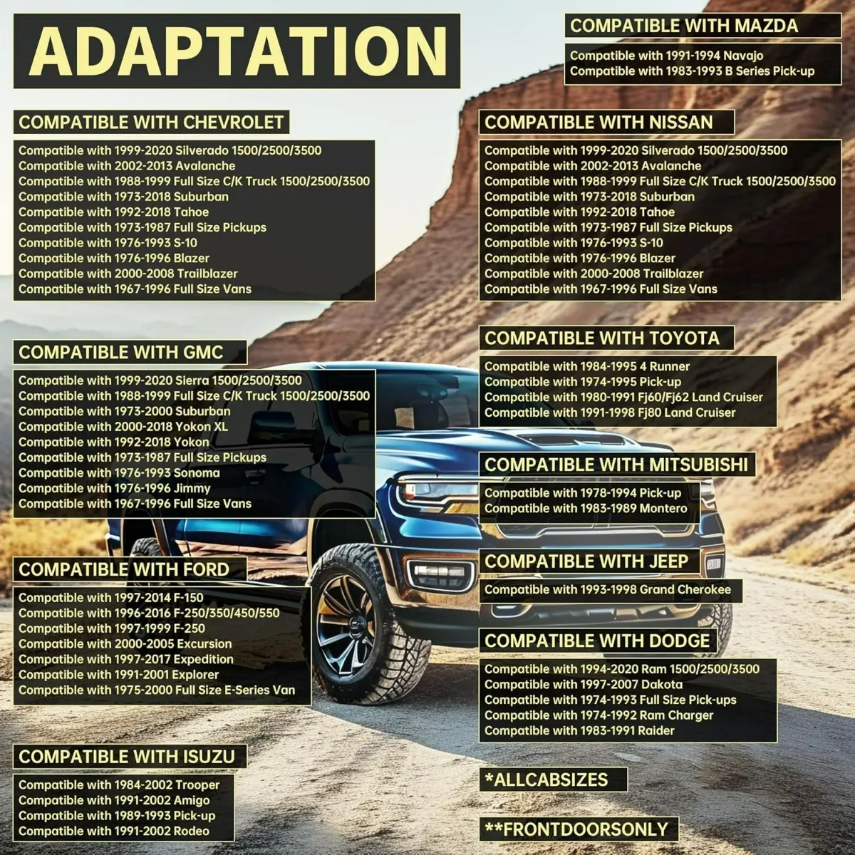 ·Fitment1: Compatible with 1967-2020 Silverado Avalanche Suburban Tahoe S-10 Blazer Trailblazer Full Size C/K Truck Vans; Compatible with 1967-2020 GMC Sierra Suburban Yokon XL Sonoma Jimmy Full Size C/K Truck Vans; Compatible with 1975-2017 Ford F150 F250 F350 F450 F550 Excursion Expedition Explorer Full Size E-Series Van; Compatible with 1974-2020 Dodge RAM Dakota Charger Raider Full Size Pick-ups