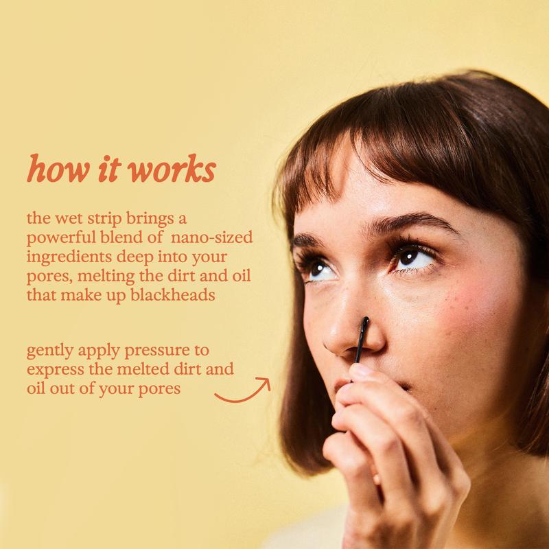 These innovative nose strips use nanotechnology to bring a powerful blend of ingredients deep into your pores, melting the dirt and oil that make up blackheads. Just apply the wet strip to your nose for 5-10 minutes, remove, then apply light pressure to gently remove the liquefied gunk from your skin, leaving your pores clean and undamaged.Â