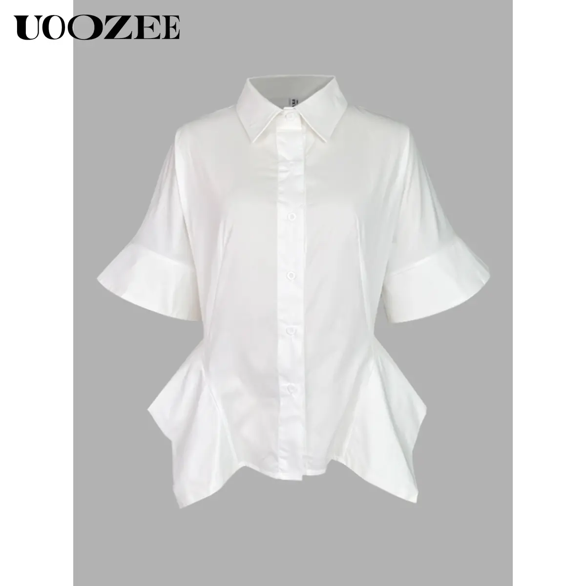 ·Design Details: Pointed collar (timeless and professional), button-front closure (classic and adjustable), flared elbow sleeves (trendy and feminine), fitted waist with peplum detailing (flattering and structured), and asymmetrical hem (modern and eye-catching).
