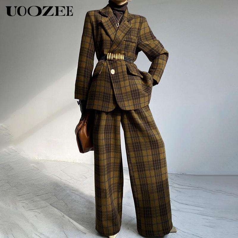 The UOOZEE Women's suit perfect for formal business occasions. It features long sleeves and a loose fit, ensuring comfort and style. The blazer comes with pockets and is designed without a belt. The suit is new for 2025, it is a versatile addition to any wardrobe. Ideal for autumn and winter, a must-have for elegant looks.